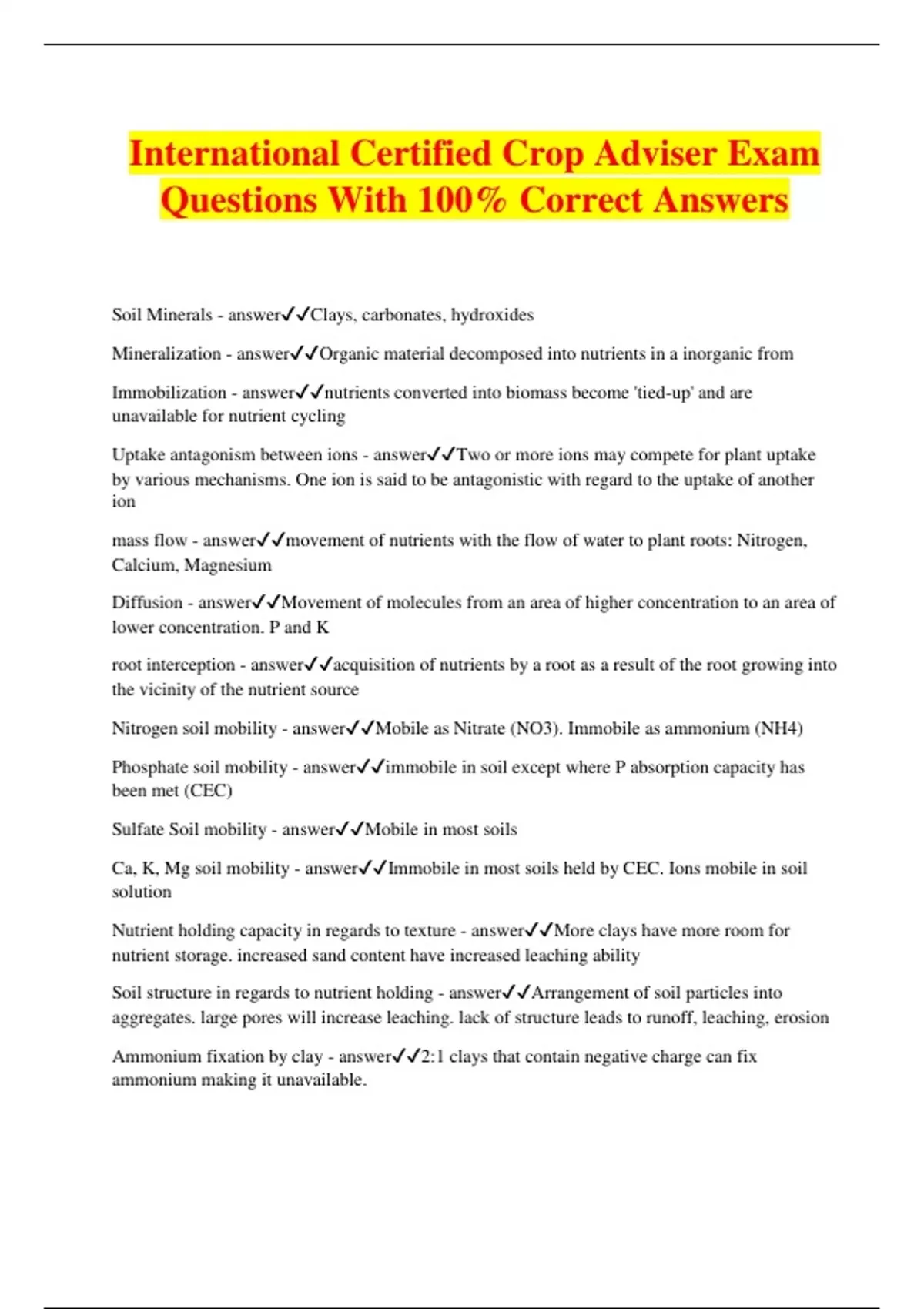 International Certified Crop Adviser Exam Questions With 100% Correct Answers Soil Minerals - answerClays, carbonates, hydroxides Mineralization - answerOrganic material decomposed into nutrients in a inorganic from Immobilization - answernutrients converted into biomass become 'tied-up' and are unavailable for nutrient cycling Uptake antagonism between ions - answerTwo or more ions may compete for plant uptake by various mechanisms. One ion is said to be antagonistic with regard to the uptake of another ion mass flow - answermovement of nutrients with the flow of water to plant roots: Nitrogen, Calcium, Magnesium Diffusion - answerMovement of molecules from an area of higher concentration to an area of lower concentration. P and K root interception - answeracquisition of nutrients by a root as a result of the root growing into the vicinity of the nutrient source