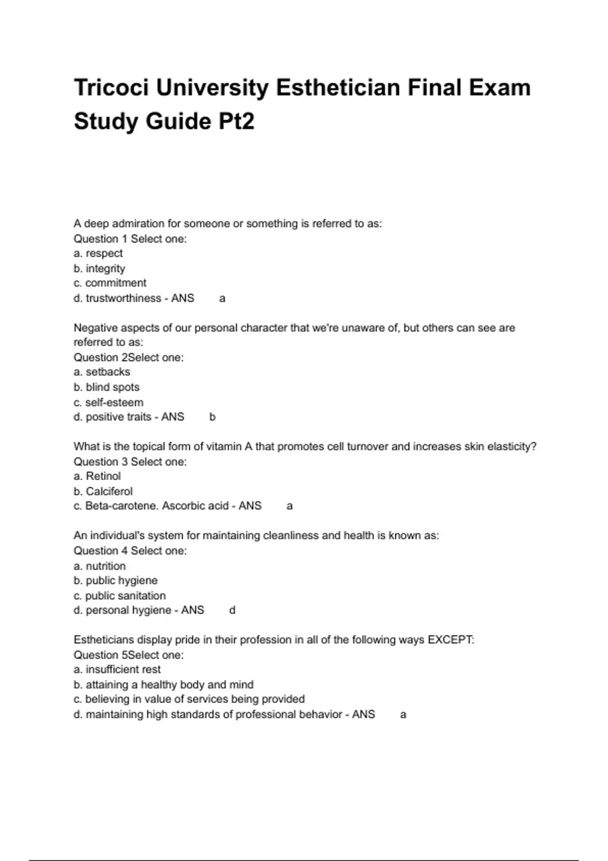 A deep admiration for someone or something is referred to as: Question 1 Select one: a. respect b. integrity c. commitment d. trustworthiness - ANS a Negative aspects of our personal character that we're unaware of, but others can see are referred to as: Question 2Select one: a. setbacks b. blind spots c. self-esteem d. positive traits - ANS b What is the topical form of vitamin A that promotes cell turnover and increases skin elasticity? Question 3 Select one: a. Retinol b. Calciferol c. Beta-carotene. Ascorbic acid - ANS a An individual's system for maintaining cleanliness and health is known as: Question 4 Select one: a. nutrition b. public hygiene c. public sanitation d. personal hygiene - ANS d Estheticians display pride in their profession in all of the following ways EXCEPT: Question 5Select one: a. insufficient rest b. attaining a healthy body and mind c. believing in value of services being provided d. maintaining high standards of professional behavior - ANS a Estheticians display pride in their profession in all of the following ways EXCEPT: Question 5Select one: a. insufficient rest b. attaining a healthy body and mind c. believing in value of services being provided d. maintaining high standards of professional behavior - ANS a An outward reflection of your inner feelings, thoughts, attitudes and values define your: Question 6 Select one: a. ethics b. personality c. commitment d. sense of humor - ANS b Al