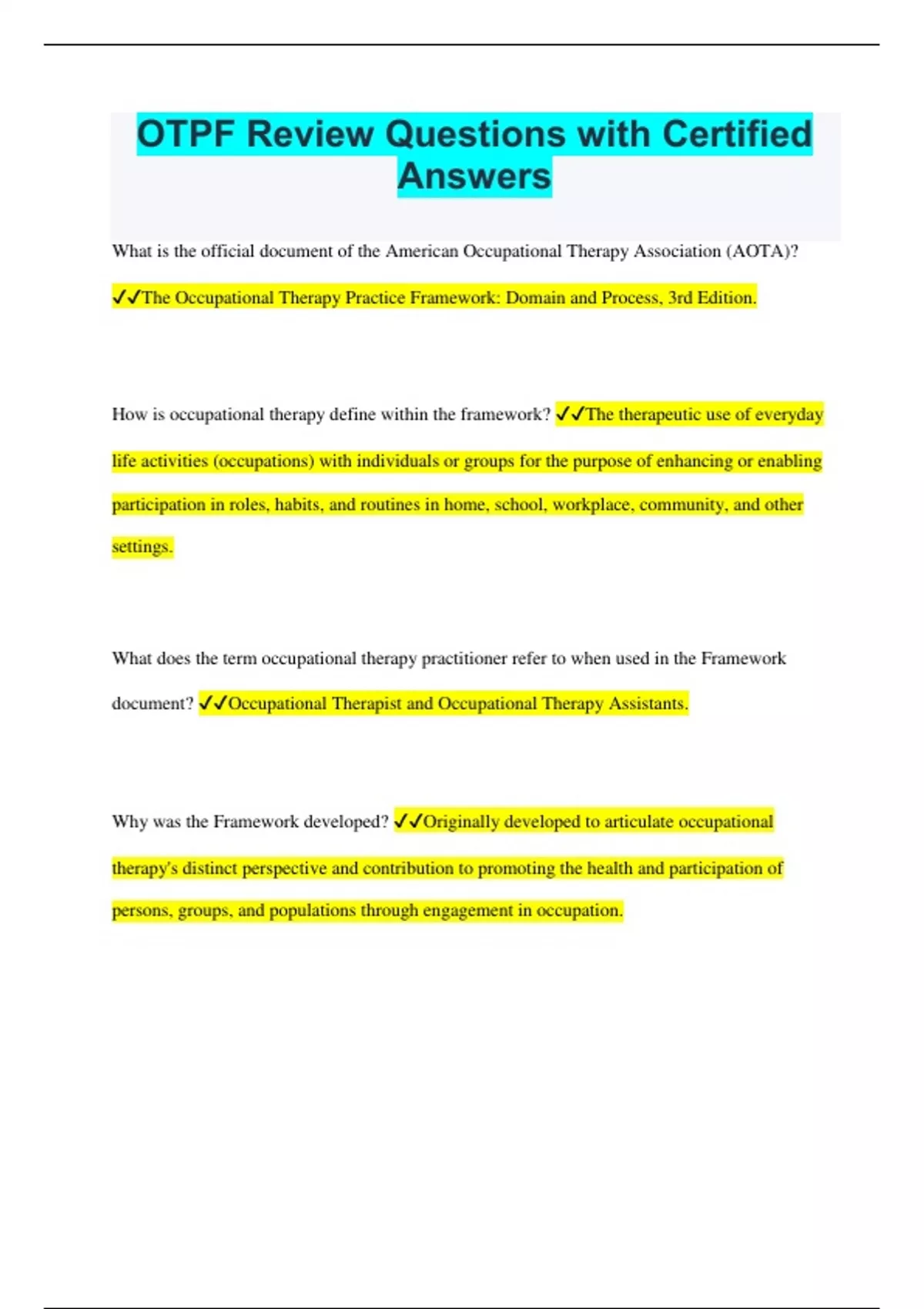 OTPF Review Questions with Certified Answers What is the official document of the American Occupational Therapy Association (AOTA)? The Occupational Therapy Practice Framework: Domain and Process, 3rd Edition. How is occupational therapy define within the framework? The therapeutic use of everyday life activities (occupations) with individuals or groups for the purpose of enhancing or enabling participation in roles, habits, and routines in home, school, workplace, community, and other settings. What does the term occupational therapy practitioner refer to when used in the Framework document? Occupational Therapist and Occupational Therapy Assistants. Why was the Framework developed? Originally developed to articulate occupational therapy's distinct perspective and contribution to promoting the health and participation of persons, groups, and populations through engagement in occupation. What is the Framework considered and how often is it revised? The Framework is an ever- evolving document. As as official AOTA document, it is reviewed on a 5 year cycle for usefulness and the potential need for further refinements or changes. What happens during the review period for the Framework? COP (Commission on Practice) collects feedback from members, scholars, authors, practitioners, and other stakeholders. Why is the revision of Framework important? The revision process ensures that the Framework maintain its integrity while responding to internal and external influences that should be reflected in emerging concepts and advances in Occupational Therapy. How is the Framework divided? Into 1. Domain 2. Process What is the domain section in the Framework? The area that outlines the profession's purview and the areas in which its members have an established body of knowledge and expertise. What is the process section in the Framework? The area that describes the actions practitioners take when providing services that are client centered and focused on engagement in occupations. What is linked inextricably in a transactional relationship? The Domain and Process within the Framework. What is the overarching statement that describes the domain and process of Occupational Therapy? Achieving health, well being, and participation in life through engagement in occupation. What is Health defined as in Framework? a state of complete physical, mental, and social well-being, and not merely the absence of disease or infirmity. What is Well-Being defined as in the Framework? a general term encompassing the total universe of human life domains, including physical, mental, and social aspects. What is Participation defined as in the Framework? involvement in a life situation What is engagement in occupation as defined in the Framework? performance of occupations, as the result of choice, motivation, and meaning within a supportive context and environment. What are the 5 areas of Domain? Occupation, Client Factors, Performance Skills, Performance Patterns, and Context and Environment. What is an Occupation? Refers to the daily life activities in which people engage. What is the difference in ADL's and IADL's? ADL's are activities that are oriented toward taking care of ones own body while IADL's are activities that support daily life within the home and community that often require more complex interactions that those used in ADL's. What is a co-occupation? occupations that implicitly