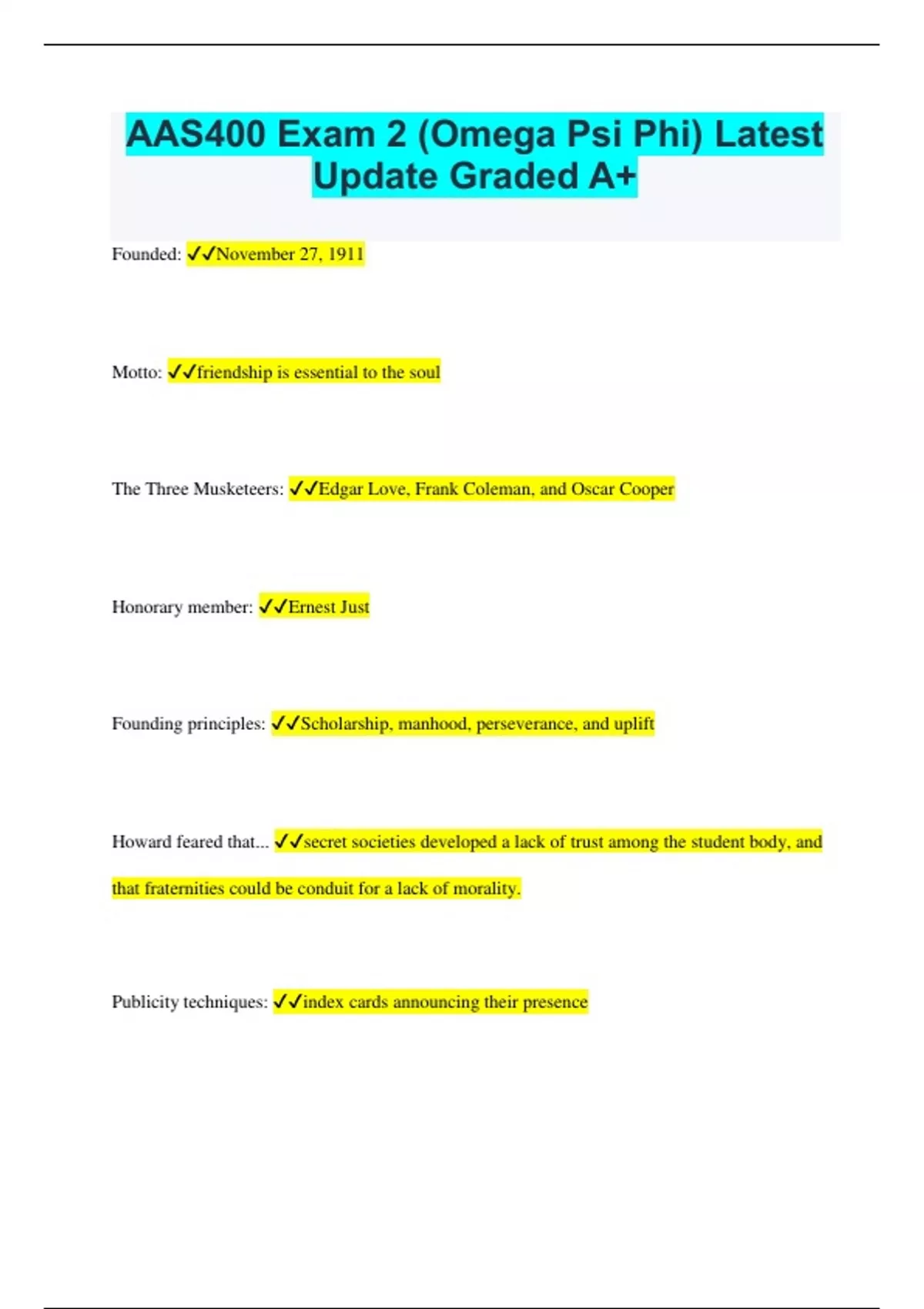 AAS400 Exam 2 (Omega Psi Phi) Latest Update Graded A+ Founded: November 27, 1911 Motto: friendship is essential to the soul The Three Musketeers: Edgar Love, Frank Coleman, and Oscar Cooper Honorary member: Ernest Just Founding principles: Scholarship, manhood, perseverance, and uplift Howard feared that... secret societies developed a lack of trust among the student body, and that fraternities could be conduit for a lack of morality. Publicity techniques: index cards announcing their presence What did Howard announce at a speech: Omega Psi Phi fraternity didn't exist Plan against discouragement of administration: personal lobbying of the faculty. Met directly with Dr. Thirkield to win his approval Conditions put forth by Howard administration: if at anytime the fraternity showed immoral behavior, the Howard administration would have the power to disband it and remove all index cards Year incorporated: 1914 officers in Iowa the brothers of Omega found this as an opportunity to strengthen the brotherhood. War chapter: Omegas who were apart of the officer training in Iowa were permitted to initiate people who they thought deserved membership Second chapter founded: Lincoln University Edgar love & Oscar Cooper: sprouted the initial idea for the fraternity Focus in 1940s socioeconomics Carter G. Woodson: founded annual Negro