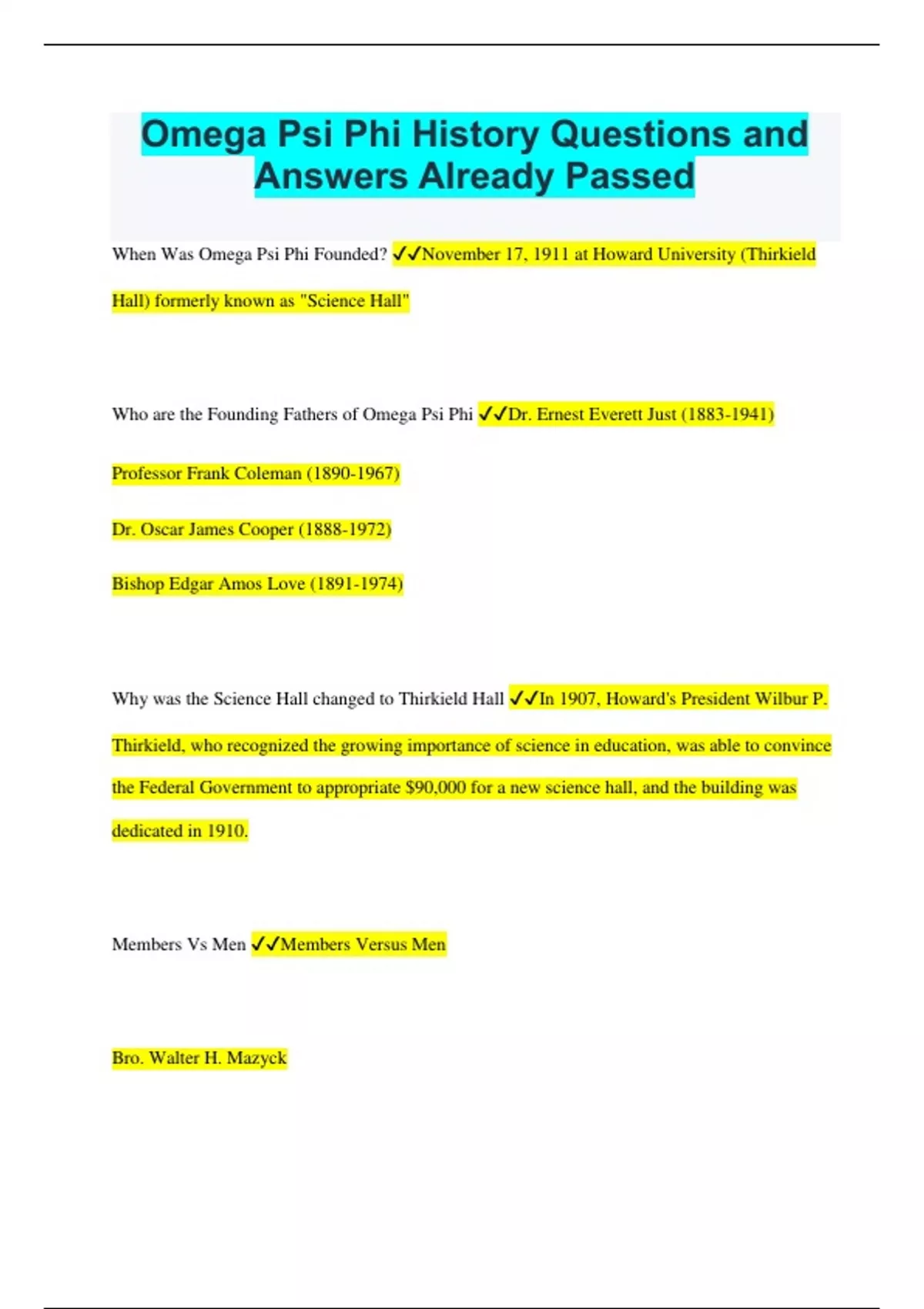 Omega Psi Phi History Questions and Answers Already Passed When Was Omega Psi Phi Founded? November 17, 1911 at Howard University (Thirkield Hall) formerly known as "Science Hall" Who are the Founding Fathers of Omega Psi Phi Dr. Ernest Everett Just () Professor Frank Coleman () Dr. Oscar James Cooper () Bishop Edgar Amos Love () Why was the Science Hall changed to Thirkield Hall In 1907, Howard's President Wilbur P. Thirkield, who recognized the growing importance of science in education, was able to convince the Federal Government to appropriate $90,000 for a new science hall, and the building was dedicated in 1910. Members Vs Men Members Versus Men Bro. Walter H. Mazyck The Greek Letter Societies among our group appear to have entered into a period of mad competition for obtaining members. Pledges are increasing in numbers. Scarcely a student on the college campus but wears a pledge pin or a frat pin. Are the fraternities forgetting their original high standards? Can it be said that every man who enters college is of Fraternity material? If in any place, Omega has entered this mad race for members, pause and consider. The value of our Fraternity is not in numbers, but in men, in real brotherhood. Eight men thoroughly immersed in the true Omega spirit are far greater assets than eighty with lukewarm enthusiasm. What is the Omega Psi Phi motto" "Friendship Is Essential to the Soul" What are the Cardinal Principals of Omega Psi Phi? Manhood Scholarship Perserverance Uplift When was Omega Psi Phi Incoporated? Omega Psi Phi was incorporated under the laws of the District of Columbia on October 28, 1914. When was Alpha Chapter Formed? Alpha chapter was organized with fourteen charter members on December 15, 1911. Brothers Edgar A. Love, Oscar J. Cooper and Frank Coleman were elected the chapter first Basileus, Keeper of Records, and Keeper of Seals, respectively. Who was the First Grand Basileus of Omega Psi Phi? Bishop Edgar Amos Love - November 23, 1911 Dr. Oscar James Cooper as Grand Keeper of Records (Grand Keeper of Records and Seals or Grand KRS) Professor Frank Coleman as Grand Keeper of Seals (Grand Keeper of Finance or Grand KF). Recite "Invictus" Invictus By William Ernest Henley Out of the night that covers me, Black as the pit from pole to pole, I thank whatever gods may be