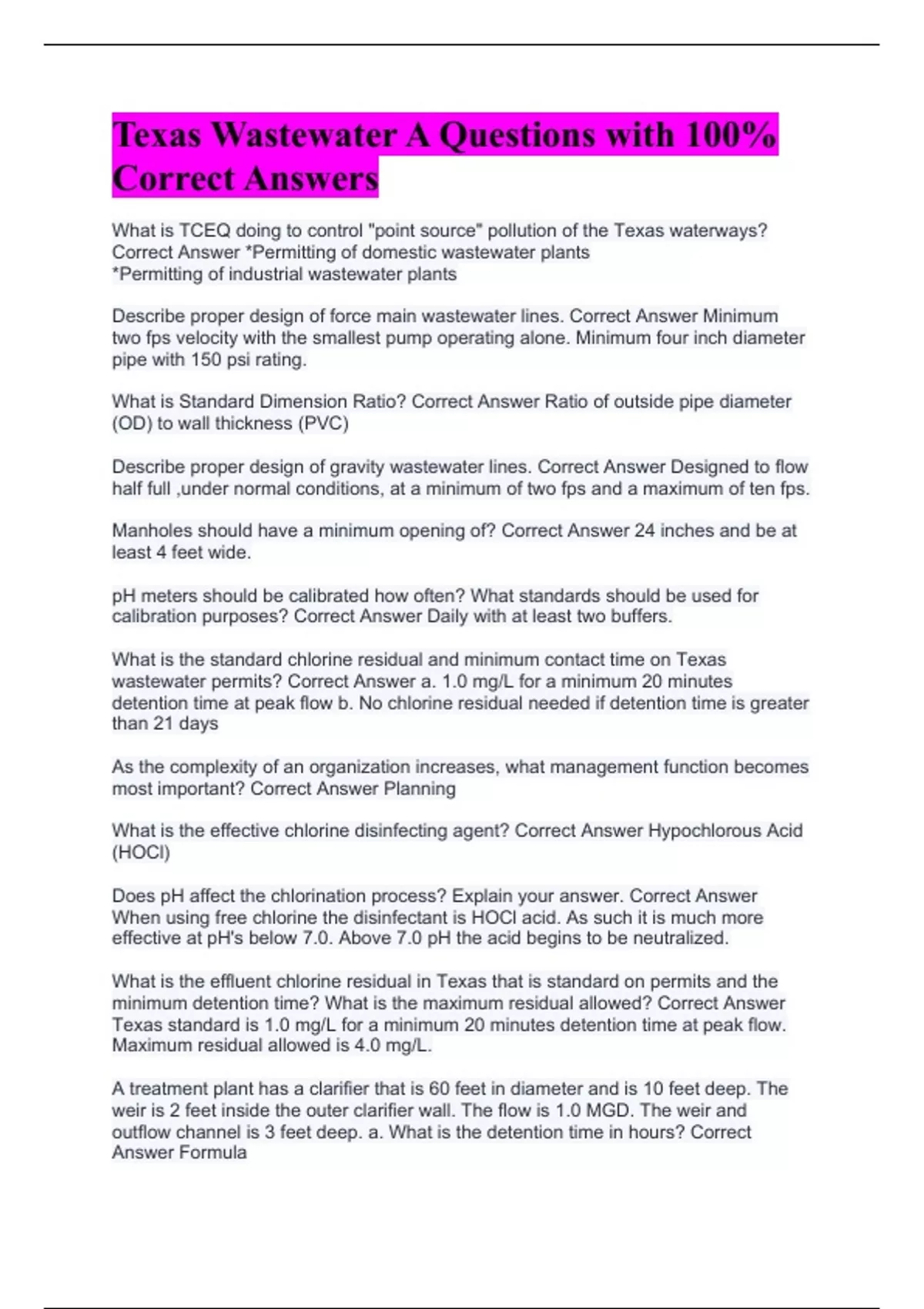 What is TCEQ doing to control "point source" pollution of the Texas waterways? Correct Answer *Permitting of domestic wastewater plants *Permitting of industrial wastewater plants Describe proper design of force main wastewater lines. Correct Answer Minimum two fps velocity with the smallest pump operating alone. Minimum four inch diameter pipe with 150 psi rating. What is Standard Dimension Ratio? Correct Answer Ratio of outside pipe diameter (OD) to wall thickness (PVC) Describe proper design of gravity wastewater lines. Correct Answer Designed to flow half full ,under normal conditions, at a minimum of two fps and a maximum of ten fps. Manholes should have a minimum opening of? Correct Answer 24 inches and be at least 4 feet wide. pH meters should be calibrated how often? What standards should be used for calibration purposes? Correct Answer Daily with at least two buffers. What is the standard chlorine residual and minimum contact time on Texas wastewater permits? Correct Answer a. 1.0 mg/L for a minimum 20 minutes detention time at peak flow b. No chlorine residual needed if detention time is greater than 21 days As the complexity of an organization increases, what management function becomes most important? Correct Answer Planning What is the effective chlorine disinfecting agent? Correct Answer Hypochlorous Acid (HOCl) Does pH affect the chlorination process? Explain your answer. Correct Answer When using free chlorine the disinfectant is HOCl acid. As such it is much more effective at pH's below 7.0. Above 7.0 pH the acid begins to be neutralized. What is the effluent chlorine residual in Texas that is standard on permits and the minimum detention time? What is the maximum residual allowed? Correct Answer Texas standard is 1.0 mg/L for a minimum 20 minutes detention time at peak flow. Maximum residual allowed is 4.0 mg/L. A treatment plant has a clarifier that is 60 feet in diameter and is 10 feet deep. The weir is 2 feet inside the outer clarifier wall. The flow is 1.0 MGD. The weir and outflow channel is 3 feet deep. a. What is the detention time in hours? Correct Answer Formula