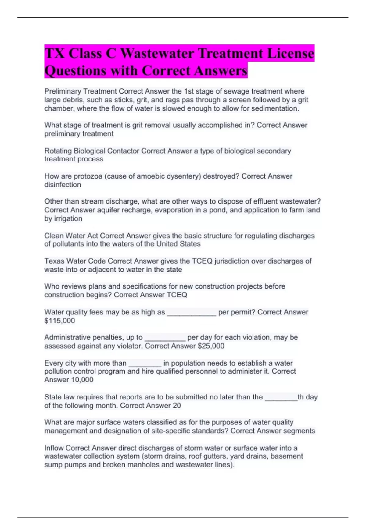 TX Class C Wastewater Treatment License Questions with Correct Answers