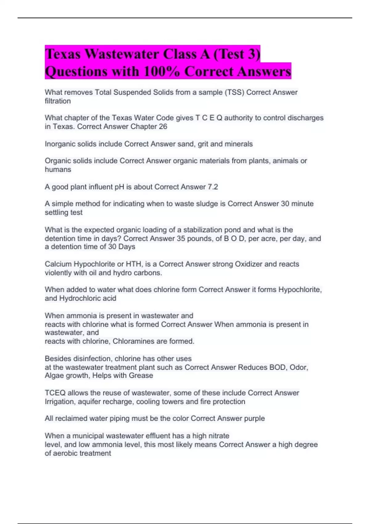 What removes Total Suspended Solids from a sample (TSS) Correct Answer filtration What chapter of the Texas Water Code gives T C E Q authority to control discharges in Texas. Correct Answer Chapter 26 Inorganic solids include Correct Answer sand, grit and minerals Organic solids include Correct Answer organic materials from plants, animals or humans A good plant influent pH is about Correct Answer 7.2 A simple method for indicating when to waste sludge is Correct Answer 30 minute settling test What is the expected organic loading of a stabilization pond and what is the detention time in days? Correct Answer 35 pounds, of B O D, per acre, per day, and a detention time of 30 Days Calcium Hypochlorite or HTH, is a Correct Answer strong Oxidizer and reacts violently with oil and hydro carbons. When added to water what does chlorine form Correct Answer it forms Hypochlorite, and Hydrochloric acid When ammonia is present in wastewater and reacts with chlorine what is formed Correct Answer When ammonia is present in wastewater, and reacts with chlorine, Chloramines are formed. Besides disinfection, chlorine has other uses at the wastewater treatment plant such as Correct Answer Reduces BOD, Odor, Algae growth, Helps with Grease TCEQ allows the reuse of wastewater, some of these include Correct Answer Irrigation, aquifer recharge, cooling towers and fire protection All reclaimed water piping must be the color Correct Answer purple When a municipal wastewater effluent has a high nitrate level, and low ammonia level, this most likely means Correct Answer a high degree of aerobic treatment