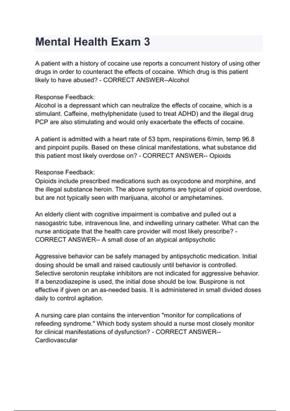 A patient with a history of cocaine use reports a concurrent history of using other drugs in order to counteract the effects of cocaine. Which drug is this patient likely to have abused? - CORRECT ANSWER--Alcohol Response Feedback: Alcohol is a depressant which can neutralize the effects of cocaine, which is a stimulant. Caffeine, methylphenidate (used to treat ADHD) and the illegal drug PCP are also stimulating and would only exacerbate the effects of cocaine. A patient is admitted with a heart rate of 53 bpm, respirations 6/min, temp 96.8 and pinpoint pupils. Based on these clinical manifestations, what substance did this patient most likely overdose on? - CORRECT ANSWER-- Opioids Response Feedback: Opioids include prescribed medications such as oxycodone and morphine, and the illegal substance heroin. The above symptoms are typical of opioid overdose, but are not typica