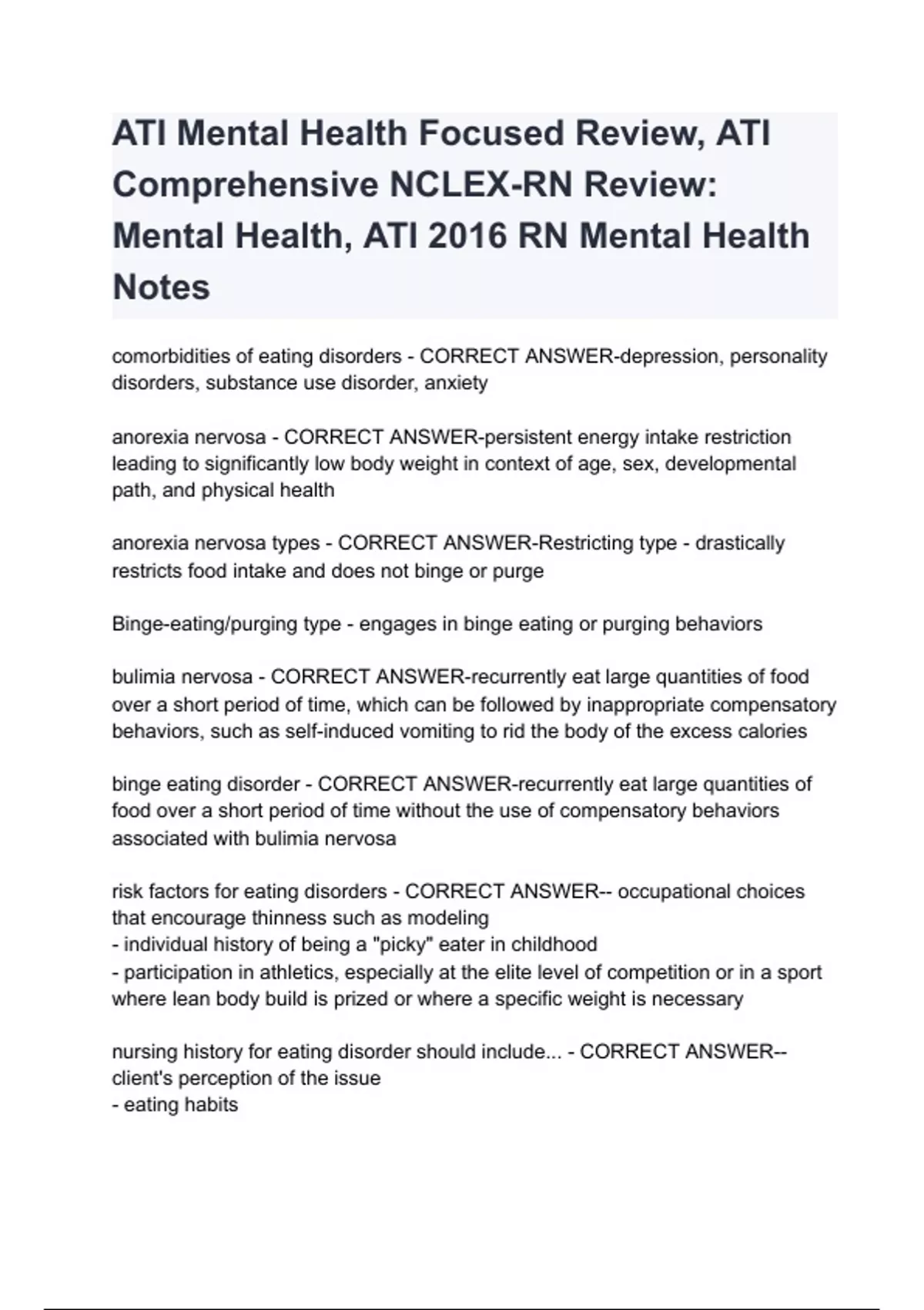 ATI Mental Health Focused Review, ATI Comprehensive NCLEX-RN Review: Mental Health, ATI 2016 RN Mental Health Notes