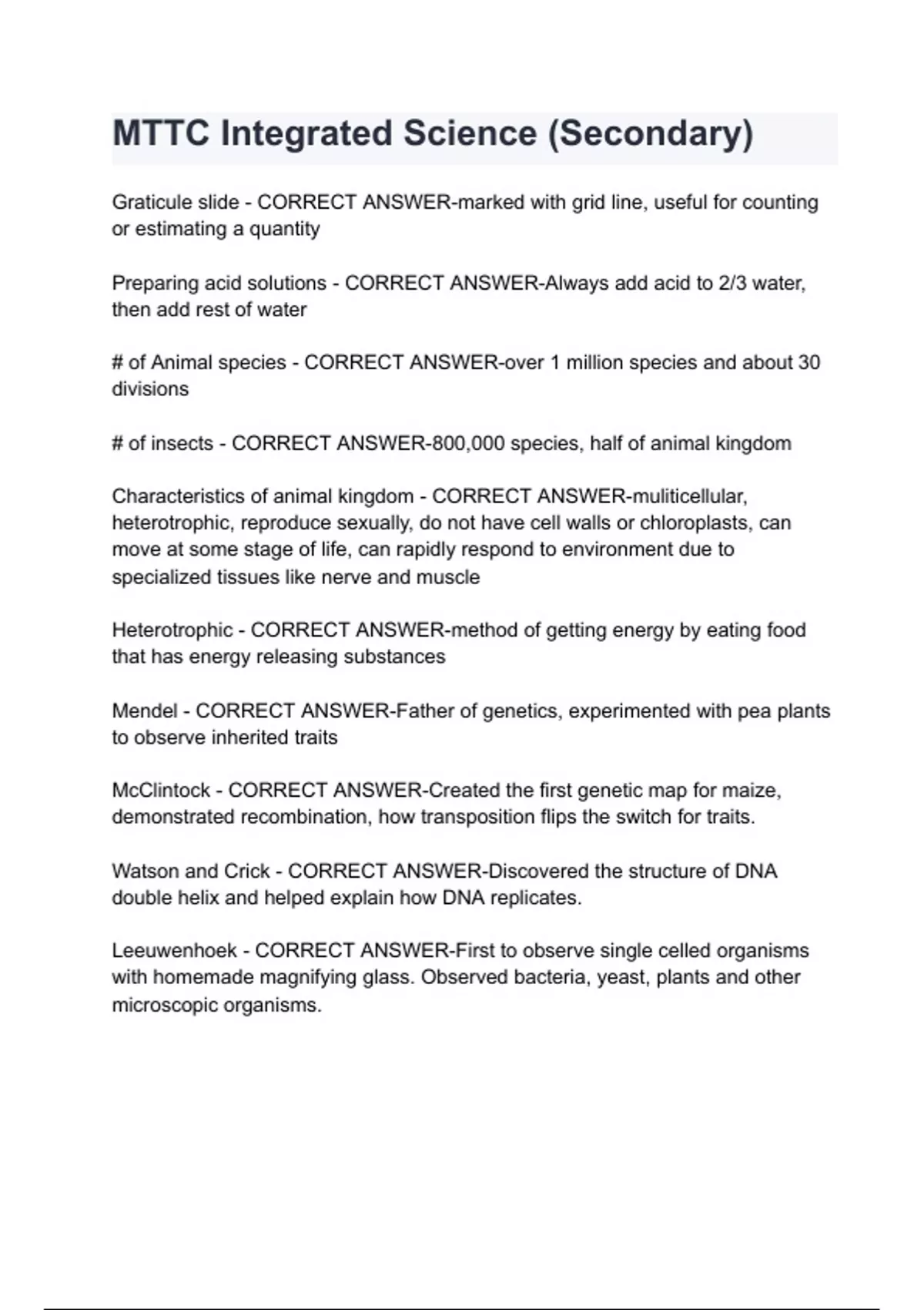 Graticule slide - CORRECT ANSWER-marked with grid line, useful for counting or estimating a quantity Preparing acid solutions - CORRECT ANSWER-Always add acid to 2/3 water, then add rest of water # of Animal species - CORRECT ANSWER-over 1 million species and about 30 divisions # of insects - CORRECT ANSWER-800,000 species, half of animal kingdom Characteristics of animal kingdom - CORRECT ANSWER-muliticellular, heterotrophic, reproduce sexually, do not have cell walls or chloroplasts, can move at some stage of life, can rapidly respond to environment due to specialized tissues like nerve and muscle Heterotrophic - CORRECT ANSWER-method of getting energy by eating food that has energy releasing substances Mendel - CORRECT ANSWER-Father of genetics, experimented with pea plants to observe inherited traits McClintock - CORRECT ANSWER-Created the first genetic map for maize, demonstrated recombination, how transposition flips the switch for traits. Watson and Crick - C