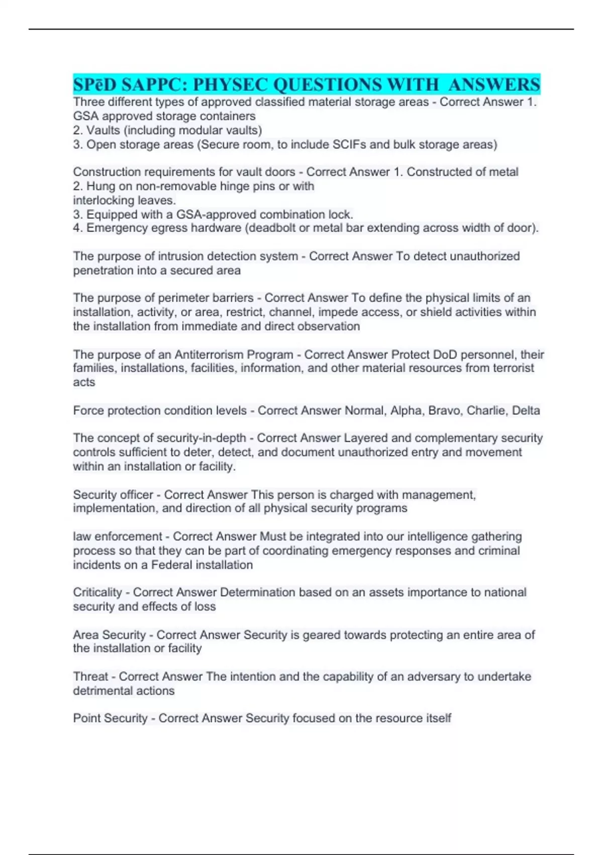 Three different types of approved classified material storage areas - Correct Answer 1. GSA approved storage containers 2. Vaults (including modular vaults) 3. Open storage areas (Secure room, to include SCIFs and bulk storage areas) Construction requirements for vault doors - Correct Answer 1. Constructed of metal 2. Hung on non-removable hinge pins or with interlocking leaves. 3. Equipped with a GSA-approved combination lock. 4. Emergency egress hardware (deadbolt or metal bar extending across width of door). The purpose of intrusion detection system - Correct Answer To detect unauthorized penetration into a secured area The purpose of perimeter barriers - Correct Answer To define the physical limits of an installation, activity, or area, restrict, channel, impede access, or shield activities within the installation from immediate and direct observation The purpose of an Antiterrorism Program - Correct Answer Protect DoD personnel, their families, installations, facilities, information, and other material resources from terrorist acts Force protection condition levels - Correct Answer Normal, Alpha, Bravo, Charlie, Delta The concept of security-in-depth - Correct Answer Layered and complementary security controls sufficient to deter, detect, and document unauthorized entry and movement within an installation or facility. Security officer - Correct Answer This person is charged with management, implementation, and direction of all physical security programs law enforcement - Correct Answer Must be integrated into our intelligence gathering process so that they can be part of coordinating emergency responses and criminal incidents on a Federal installation Criticality - Correct Answer Determination based on an assets importance to national security and effects of loss Area Security - Correct Answer Security is geared towards protecting an entire area of the installation or facility Threat - Correct Answer The intention and the capability of an adversary to undertake detrimental actions Point Security - Correct Answer Security focused on the resource itself Effec