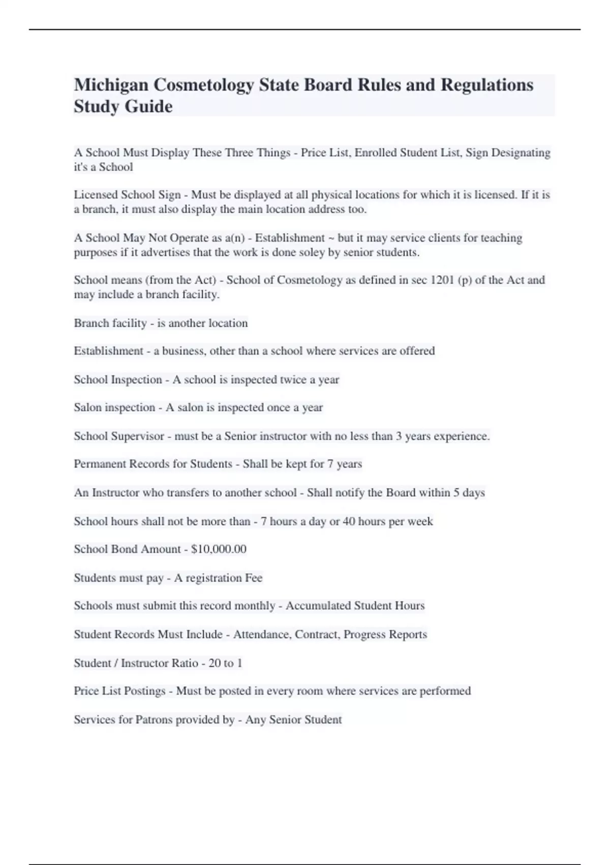 Michigan Cosmetology State Board Rules and Regulations Study Guide A School Must Display These Three Things - Price List, Enrolled Student List, Sign Designating it's a School Licensed School Sign - Must be displayed at all physical locations for which it is licensed. If it is a branch, it must also display the main location address too. A School May Not Operate as a(n) - Establishment ~ but it may service clients for teaching purposes if it advertises that the work is done soley by senior students. School means (from the Act) - School of Cosmetology as defined in sec 1201 (p) of the Act and may include a branch facility. Branch facility - is another location Establishment - a business, other than a school where services are offered School Inspection - A school is inspected twice a year Salon inspection - A salon is inspected once a year School Supervisor - must be a Senior instructor with no less than 3 years experience. Permanent Records for Students - Shall be kept for 7 years An Instructor who transfers to another school - Shall notify the Board within 5 days School hours shall not be more than - 7 hours a day or 40 hours per week School Bond Amount - $10,000.00 Students must pay - A registration Fee Schools must submit this record monthly - Accumulated Student Hours Student Records Must Include - Attendance, Contract, Progress Reports Student / Instructor Ratio - 20 to 1 Price List Postings - Must be posted in every room where services are performed Services for Patrons provided by - Any Senior Student A Student Must have (Grade Education Requirement ) - At least a 9th Grade Education Student Age Requirement - 16 years of age LOA before reregistering - Max 5 months MPAs (Minimum Practical Applications) - Services performed on a Mannequin, another student or customer Cosmetology Student Can Practice on the General Public - After Completing 350 hours An Apprentice of Cosmetology Must Complete X months before applying to the Board - 24 months A Student of Cosmetology may complete the course in X months - 10 Months Within the last 300 hours of cosmetology training - 35 hours are spent in review School training hours vs Apprentice Training hours - shall not be cross-credited A cosmetology establishment must have this to have an apprentice - A list of equipment Junior Student of Junior Apprentice Cannot - Work on the General Public Senior Student or Senior Apprentice - Are qualified to work on the general public All Students Must Wear - A uniform and Nametag Cosmetology Length of Program (Term) - 1500 hours Cosmetology Trainer Program Length - 500 hours Electrologists Training Program Length - 400 hours Esthetician Program Length - 400 hours