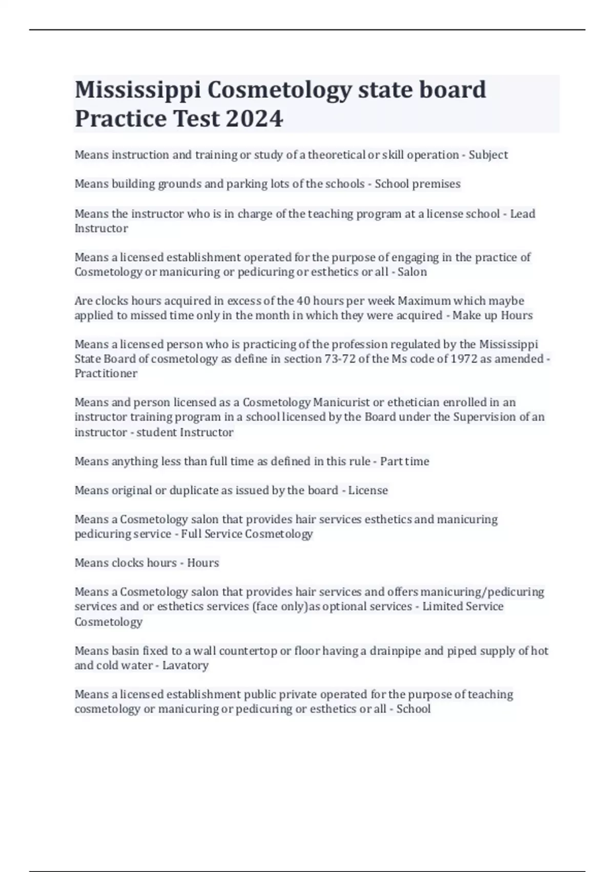 Mississippi Cosmetology state board Practice Test 2024 Means instruction and training or study of a theoretical or skill operation - Subject Means building grounds and parking lots of the schools - School premises Means the instructor who is in charge of the teaching program at a license school - Lead Instructor Means a licensed establishment operated for the purpose of engaging in the practice of Cosmetology or manicuring or pedicuring or esthetics or all - Salon Are clocks hours acquired in excess of the 40 hours per week Maximum which maybe applied to missed time only in the month in which they were acquired - Make up Hours Means a licensed person who is practicing of the profession regulated by the Mississippi State Board of cosmetology as define in section 73-72 of the Ms code of 1972 as amended - Practitioner Means and person licensed as a Cosmetology Manicurist or ethetician enrolled in an instructor training program in a school licensed by the Board under the Supervision of an instructor - student Instructor Means anything less than full time as defined in this rule - Part time Means original or duplicate as issued by the board - License Means a Cosmetology salon that provides hair services esthetics and manicuring pedicuring service - Full Service Cosmetology