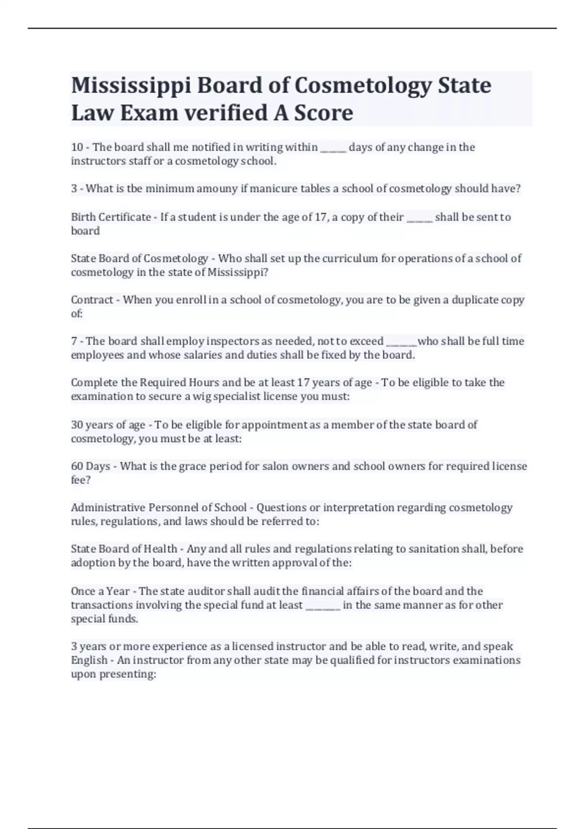 Mississippi Board of Cosmetology State Law Exam verified A Score