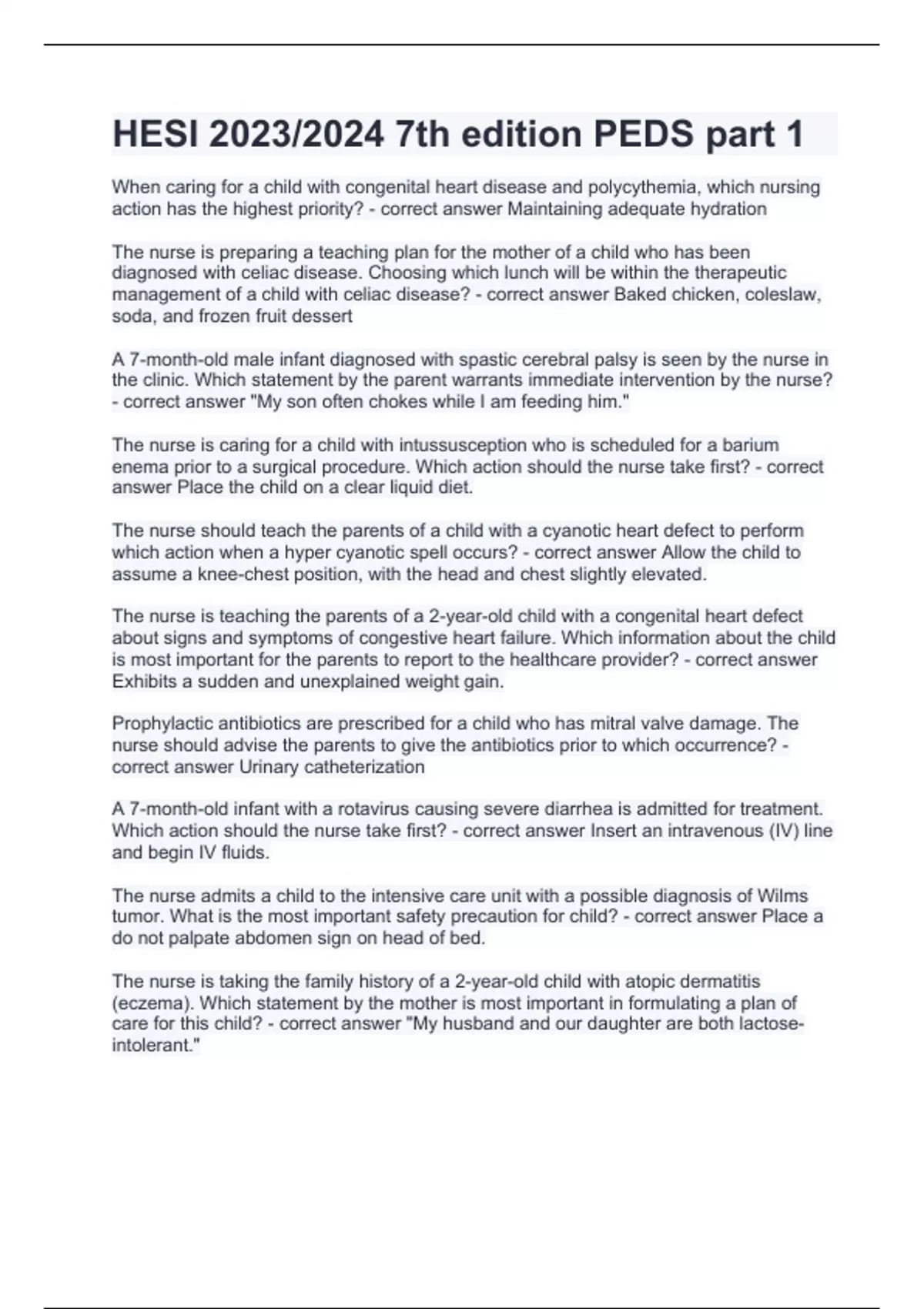 When caring for a child with congenital heart disease and polycythemia, which nursing action has the highest priority? - correct answer Maintaining adequate hydration The nurse is preparing a teaching plan for the mother of a child who has been diagnosed with celiac disease. Choosing which lunch will be within the therapeutic management of a child with celiac disease? - correct answer Baked chicken, coleslaw, soda, and frozen fruit dessert A 7-month-old male infant diagnosed with spastic cerebral palsy is seen by the nurse in the clinic. Which statement by the parent warrants immediate intervention by the nurse? - correct answer "My son often chokes while I am feeding him." The nurse is caring for a child with intussusception who is scheduled for a barium enema prior to a surgical procedure. Which action should the nurse take first? - correct answer Place the child on a clear liquid diet. The nurse should teach the parents of a child with a cyanotic heart defect to perform which action when a hyper cyanotic spell occurs? - correct answer Allow the child to assume a knee-chest position, with the head and chest slightly elevated. The nurse is teaching the parents of a 2-year-old child with a congenital heart defect about signs and symptoms of congestive heart failure. Which information about the child is most important for the parents to report to the healthcare provider? - correct answer Exhibits a sudden and unexplained weight gain. Prophylactic antibiotics are prescribed for a child who has mitral valve damage. The nurse should advise the parents to give the antibiotics prior to which occurrence? - correct answer Urinary catheterization A 7-month-old infant with a rotavirus causing severe diarrhea is admitted for treatment. Which action should the nurse take first? - correct answer Insert an intravenous (IV) line and begin IV fluids. The nurse admits a child to the intensive care unit with a possible diagnosis of Wilms tumor. What is the most important safety precaution for child? - correct answer Place a do not palpate abdomen sign on head of bed. The nurse is taking the family history of a 2-year-old child with atopic dermatitis (eczema). Which statement by the mother is most important in formulating a plan of care for this child? - correct answer "My husband and our daughter are both lactose-intolerant." A mother calls the clinic because her 6-year-old son, who has been taking prescribed antibiotics for 7 of the previous 10 days, continues to have a cough that she reports is worsening. Further questioning by the nurse reveals that the cough is nonproductive. What is the nurse's best instruction to the mother? - correct answer Bring the child to the clinic today for an examination related to the cough. The nurse is assessing a male adolescent client's knowledge of contraception. The teen states, "I have all the info I need." What is the best response by the nurse? - correct answer "Tell me what you know about birth control." The nurse is examining a male child experiencing an exacerbation of juvenile rheumatoid arthritis (JRA) and notes that mobility is greatly reduced. What is the most likely cause of the child's impaired mobility? - correct answer Joint inflammation A father of a 5-year-old calls the nurse to report that his child, who has had an upper respiratory infection, is complaining of a headache, with a rectal temperature of 103°F/39.4°C. Which action has the highest priority? - correct answer Tell the parent to take the child to the emergency department. A child comes to the school nurse complaining of itching. Further assessment reveals that the child has impetigo. What action should the nurse take? - correct answer Send the child home with the parents to see the healthcare provider before returning to school. An infant is receiving digoxin for congestive heart failure. The apical heart rate is assessed at 80 beats/min. What action should the nurse take first? - correct answer Obtain a therapeutic drug level. The nurse is conducting an initial admission assessment of a 12-month-old child in celiac crisis. Which action is most important for the nurse to take first? - correct answer Assess the child's mucous membranes and skin turgor. When inserting a nasogastric tube into the stomach of a 3-month-old infant, which action is most important for the nurse to take first? - correct answer Monitor the infant's heart rate. The nurse assigns an unlicensed assistive personnel (UAP) to provide morning care to a newly admitted child with bacterial meningitis. What is the most important instruction for the nurse to review with the UAP? - correct answer Use designated isolation precautions. The nurse is helping a family prepare to send their 7-year-old child to school for the first time. The child is wheel-chair bound, and has a permanent tracheostomy. What information must the nurse include in the teaching plan for the child? - correct answer Place suctioning supplies on the back of the wheelchair when transporting. A woman is being discharged following the birth of her second child. Her first child died at 6 weeks of age because of sudden infant death syndrome (SIDS). The mother tells the nurse that she is fearful that this infant will also develop SIDS. What is the nurse's best response? - correct answer "The fear of losing another child to SIDS is very realistic. Have you thought about what support you may need?" A 3-week-old infant is referred to an orthopedic clinic because the pediatrician heard a click when flexing the child's right hip during a routine physical examination. Which risk factor is most closely related to developmental hip dysplasia? - correct answer Breech presentation The nurse is teaching an adolescent girl with scoliosis about a Milwaukee brace that her healthcare provider has prescribed. Which instruction should the nurse provide to this client? - correct answer Remove the brace 1 hour each day for bathing only. Which preoperative nursing action should be in