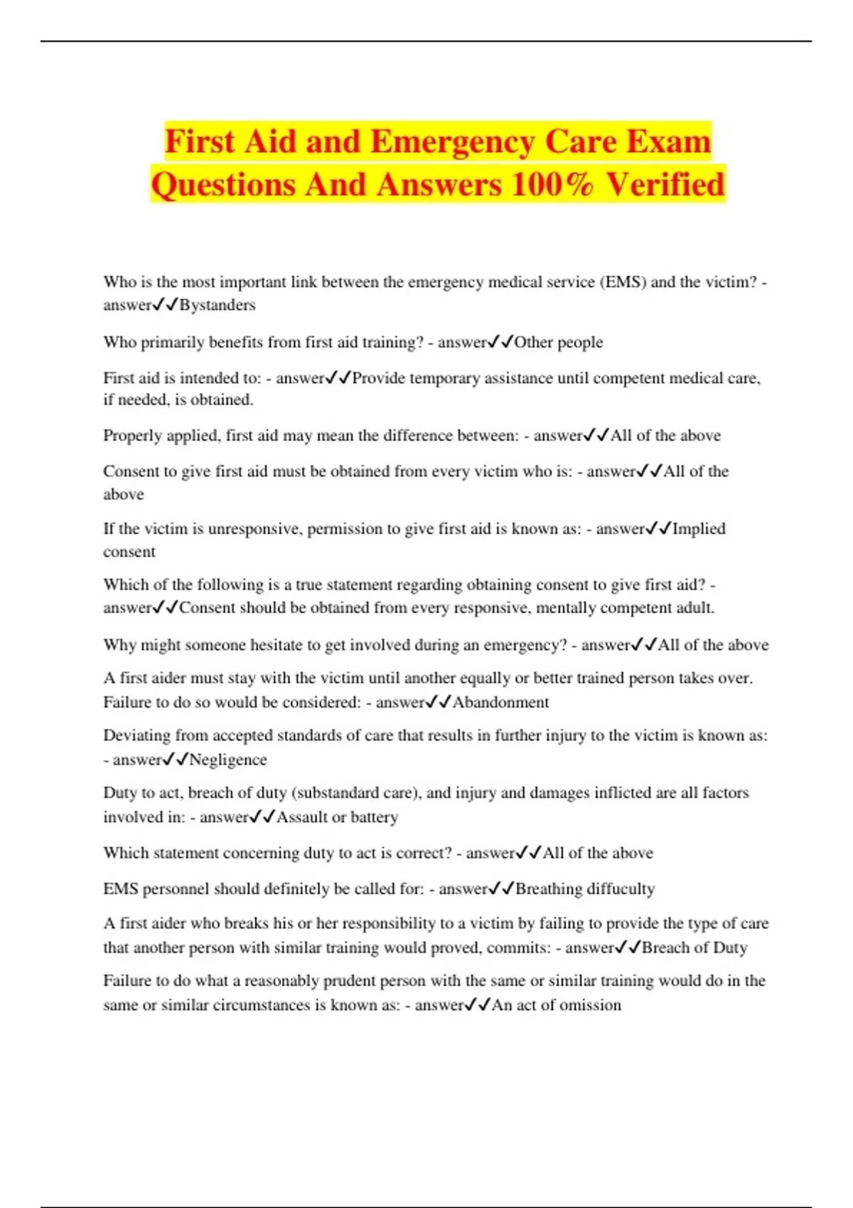 First Aid and Emergency Care Exam Questions And Answers 100% Verified Who is the most important link between the emergency medical service (EMS) and the victim? - answerBystanders Who primarily benefits from first aid training? - answerOther people First aid is intended to: - answerProvide temporary assistance until competent medical care, if needed, is obtained. Properly applied, first aid may mean the difference between: - answerAll of the above Consent to give first aid must be obtained from every victim who is: - answerAll of the above If the victim is unresponsive, permission to give first aid is known as: - answerImplied consent Which of the following is a true statement regarding obtaining consent to give first aid? - answerConsent should be obtained from every responsive, mentally competent adult. Why might someone hesitate to get involved during an emergency? - answerAll of the above A first aider must stay with the victim until another equally or better trained person takes over. Failure to do so would be considered: - answerAbandonment Deviating from accepted standards of care that results in further injury to the victim is known as: - answerNegligence Duty to act, breach of duty (substandard care), and injury and damages inflicted are all factors involved in: - answerAssault or battery Which statement concerning duty to act is correct? - answerAll of the above EMS personnel should definitely be called for: - answerBreathing diffuculty A first aider who breaks his or her responsibility to a victim by failing to provide the type of care that another person with similar training would proved, commits: - answerBreach of Duty Failure to do what a reasonably prudent person with the same or similar training would do in the same or similar circumstances is known as: - answerAn act of omission Which of the following is a sign of inadequate breathing? - answerAll of the above Cyanosis would cause what kind of skin color? - answerBlue-gray The most common type of personal protective equipment available for first aiders to protect against bloodborne pathogens is: - answerGloves The "O" in DOTS stands for: - answerOpen wound How would you check a victim's abdomen for tenderness? - answerGently press the four quadrants Which of the following is a sign? - answerMoist skin Something that the victim tells the first aider about is: - answerA symptom Which of the following is a symptom? - answerNausea The "L" in SAMPLE stands for: - answerLast oral intake The "E" in SAMPLE stands for: - answerEvents leading to the injury or illness A bystander who has seen the emergency happen is ___ to help than a bystander who arrives after the event. - answerMore likely Why might someone hesitate to get involved during an emergency? - answerAll of the above What should the rescuer look for during the scene survey? - answerAll of the above EMS personnel should definitely be summoned in which instance? - answerAll of the above In a serious situation, who should you call first? - answerEMS What information will you need to provide to the EMS dispatcher? - answerAll of the above The passage of air into and out of the lungs is called - answerRespiration The process of breathing out is called - answerExhalation A person with a back or neck injury must be handled with extreme care to prevent injury to the: - answerSpinal cord The lowest part of the sternum is called the: - answerXiphoid process Which of the following is part of the initial check? - answerB-broken bones A victim's level of responsiveness or mental status can be described according to the ___ scale. - answerAVPU The "U" in AVPU stands for - answerUnresponsive to any stimulus