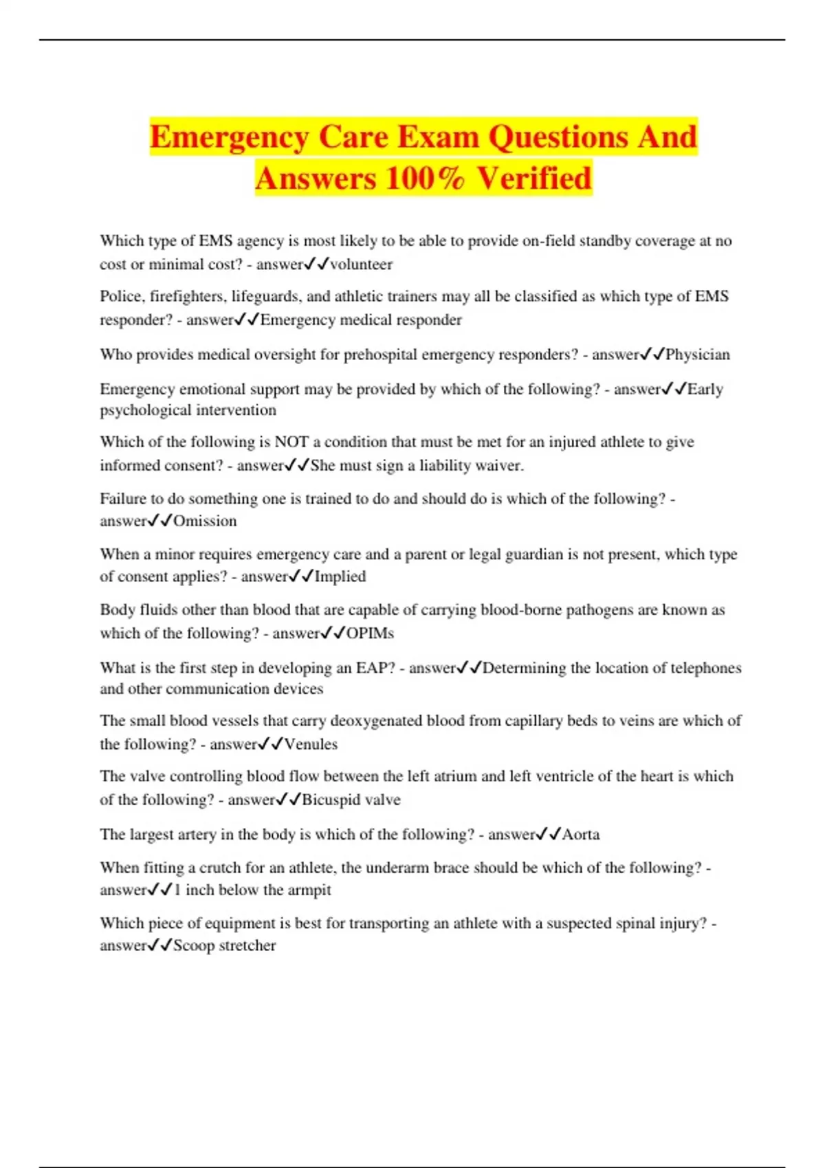 Emergency Care Exam Questions And Answers 100% Verified Which type of EMS agency is most likely to be able to provide on-field standby coverage at no cost or minimal cost? - answervolunteer Police, firefighters, lifeguards, and athletic trainers may all be classified as which type of EMS responder? - answerEmergency medical responder Who provides medical oversight for prehospital emergency responders? - answerPhysician Emergency emotional support may be provided by which of the following? - answerEarly psychological intervention Which of the following is NOT a condition that must be met for an injured athlete to give informed consent? - answerShe must sign a liability waiver. Failure to do something one is trained to do and should do is which of the following? - answerOmission When a minor requires emergency care and a parent or legal guardian is not present, which type of consent applies? - answerImplied Body fluids other than blood that are capable of carrying blood-borne pathogens are known as which of the following? - answerOPIMs What is the first step in developing an EAP? - answerDetermining the location of telephones and other communication devices The small blood vessels that carry deoxygenated blood from capillary beds to veins are which of the following? - answerVenules The valve controlling blood flow between the left atrium and left ventricle of the heart is which of the following? - answerBicuspid valve The largest artery in the body is which of the following? - answerAorta When fitting a crutch for an athlete, the underarm brace should be which of the following? - answer1 inch below the armpit Which piece of equipment is best for transporting an athlete with a suspected spinal injury? - answerScoop stretcher Which rescue move requires at least three persons but can accommodate up to six, depending on the size and weight of the athlete? - answerHammock carry The series of actions that, when implemented, reduce the mortality associated with injury or illness is known as which of the following? - answerChain of survival Which type of responder requires the highest level of EMS training? - answerParamedic Which of the following is NOT within the scope of practice of an athletic trainer when responding to an emergency? - answerTransporting an ill or injured athlete to the hospital A civil wrong recognized by courts of law as grounds for a lawsuit is which of the following? - answerTort Which of the following actions by an athletic trainer would likely result in legal liability? - answerSetting a fractured bone The purpose of Good Samaritan laws is which of the following? - answerto protect bystanders from legal liability for unintentional harm caused when assisting an injured or ill person Which condition for negligence requires that the defendant actually suffered physical, emotional, or financial harm? - answerDamage Which of the following is NOT a type of EAP? Bioterrorist attack Standard injury protocol Weather-related emergency Trauma/medical emergency - answerBioterrorist attack Which of the following is a type of white blood cell? - answerLymphocyte Fingers are __________ to the forearm. - answerDistal Which of the following rescue moves is appropriate to use when a spinal injury is suspected? Clothes drag ankle drag Packstrap carry Fireman's - answerClothes drag Which of the following rescue moves can only be used with a fully conscious person?