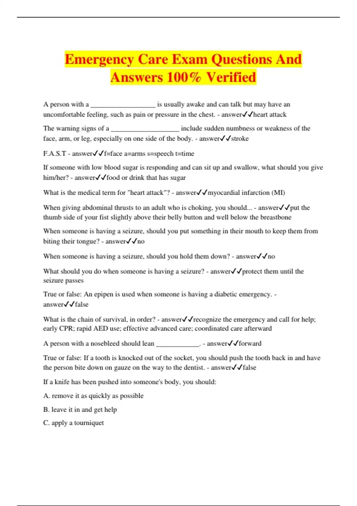 Emergency Care Exam Questions And Answers 100% Verified A person with a __________________ is usually awake and can talk but may have an uncomfortable feeling, such as pain or pressure in the chest. - answerheart attack The warning signs of a ___________________ include sudden numbness or weakness of the face, arm, or leg, especially on one side of the body. - answerstroke F.A.S.T - answerf=face a=arms s=speech t=time If someone with low blood sugar is responding and can sit up and swallow, what should you give him/her? - answerfood or drink that has sugar What is the medical term for "heart attack"? - answermyocardial infarction (MI) When giving abdominal thrusts to an adult who is choking, you should... - answerput the thumb side of your fist slightly above their belly button and well below the breastbone When someone is having a seizure, should you put something in their mouth to keep them from biting their tongue? - answerno When someone is having a seizure, should you hold them down? - answerno What should you do when someone is having a seizure? - answerprotect them until the seizure passes True or false: An epipen is used when someone is having a diabetic emergency. - answerfalse What is the chain of survival, in order? - answerrecognize the emergency and call for help; early CPR; rapid AED use; effective advanced care; coordinated care afterward A person with a nosebleed should lean ____________. - answerforward True or false: If a tooth is knocked out of the socket, you should push the tooth back in and have the person bite down on gauze on the way to the dentist. - answerfalse If a knife has been pushed into someone's body, you should: A. remove it as quickly as possible B. leave it in and get help C. apply a tourniquet D. run away - answerB. leave it