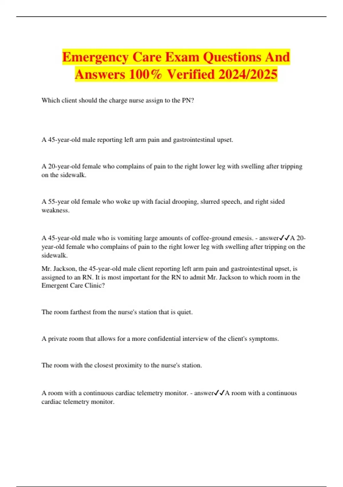 Emergency Care Exam Questions And Answers 100% Verified 2024/2025 Which client should the charge nurse assign to the PN? A 45-year-old male reporting left arm pain and gastrointestinal upset. A 20-year-old female who complains of pain to the right lower leg with swelling after tripping on the sidewalk. A 55-year old female who woke up with facial drooping, slurred speech, and right sided weakness. A 45-year-old male who is vomiting large amounts of coffee-ground emesis. - answerA 20- year-old female who complains of pain to the right lower leg with swelling after tripping on the sidewalk. Mr. Jackson, the 45-year-old male client reporting left arm pain and gastrointestinal upset, is assigned to an RN. It is most important for the RN to admit Mr. Jackson to which room in the Emergent Care Clinic? The room farthest from the nurse's station that is quiet. A private room that allows for a more confidential interview of the client's symptoms. The room with the closest proximity to the nurse's station. A room with a continuous cardiac telemetry monitor. - answerA room with a continuous cardiac telemetry monitor. Which tasks should the RN delegate to the UAP? Enter the obtained vital signs in the medical record. Ask the client to describe his left arm pain and stomach discomfort. Collect the client's psychosocial history. Identify potential nursing diagnoses for the plan of care. Place a bedside commode in the room. - answerEnter the obtained vital signs in the medical record. Place a bedside commode in the room. Which action should the RN delegate to the UAP next? Bring oxygen supplies to the room. Reduce the lighting in the room so the client can relax. Ask Mr. Jackson for the name and phone number of the person he wants contacted. Apply a continuous pulse oximeter monitor to the client. - answerApply a continuous pulse oximeter monitor to the client. Which prescription should the RN plan to implement first for Mr. Jackson? Administer sublingual nitroglycerin (NTG). Draw blood for cardiac enzymes. Oxygen at 4 liters per nasal cannula. Administer a nebulizer treatment. - answerOxygen at 4 liters per nasal cannula. Which inquiry is most important