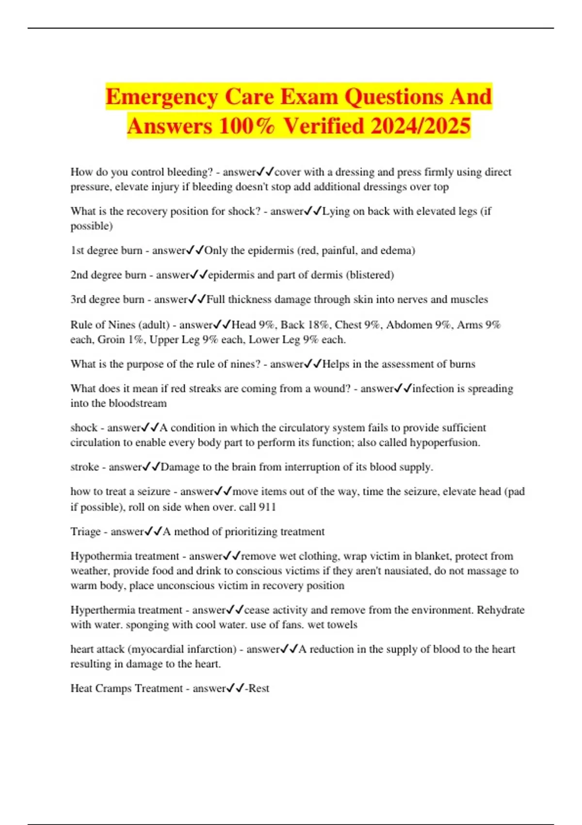 Emergency Care Exam Questions And Answers 100% Verified 2024/2025 How do you control bleeding? - answercover with a dressing and press firmly using direct pressure, elevate injury if bleeding doesn't stop add additional dressings over top What is the recovery position for shock? - answerLying on back with elevated legs (if possible) 1st degree burn - answerOnly the epidermis (red, painful, and edema) 2nd degree burn - answerepidermis and part of dermis (blistered) 3rd degree burn - answerFull thickness damage through skin into nerves and muscles Rule of Nines (adult) - answerHead 9%, Back 18%, Chest 9%, Abdomen 9%, Arms 9% each, Groin 1%, Upper Leg 9% each, Lower Leg 9% each. What is the purpose of the rule of nines? - answerHelps in the assessment of burns What does it mean if red streaks are coming from a wound? - answerinfection is spreading into the bloodstream shock - answerA condition in which the circulatory system fails to provide sufficient circulation to enable every body part to perform its function; also called hypoperfusion. stroke - answerDamage to the brain from interruption of its blood supply.
