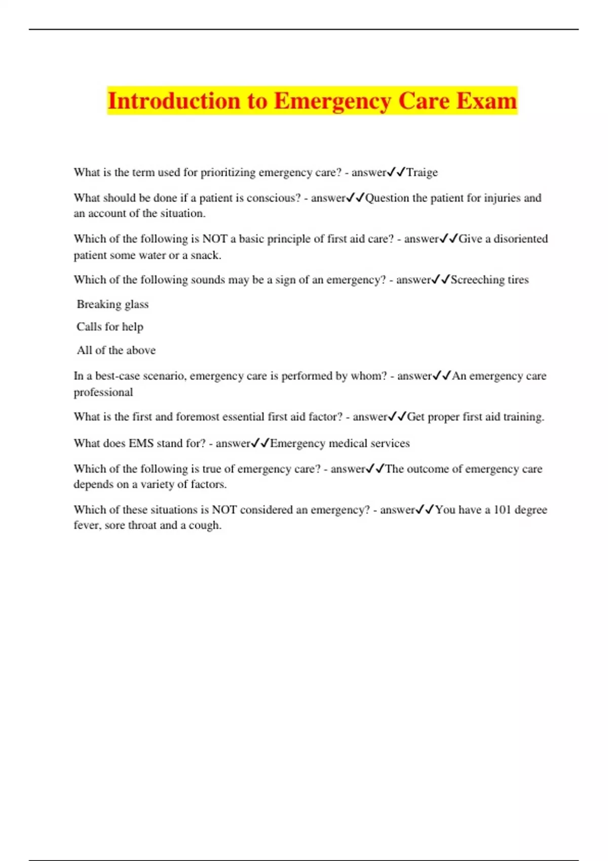 Introduction to Emergency Care Exam What is the term used for prioritizing emergency care? - answerTraige What should be done if a patient is conscious? - answerQuestion the patient for injuries and an account of the situation. Which of the following is NOT a basic principle of first aid care? - answerGive a disoriented patient some water or a snack. Which of the following sounds may be a sign of an emergency? - answerScreeching tires Breaking glass Calls for help All of the above In a best-case scenario, emergency care is performed by whom? - answerAn emergency care professional