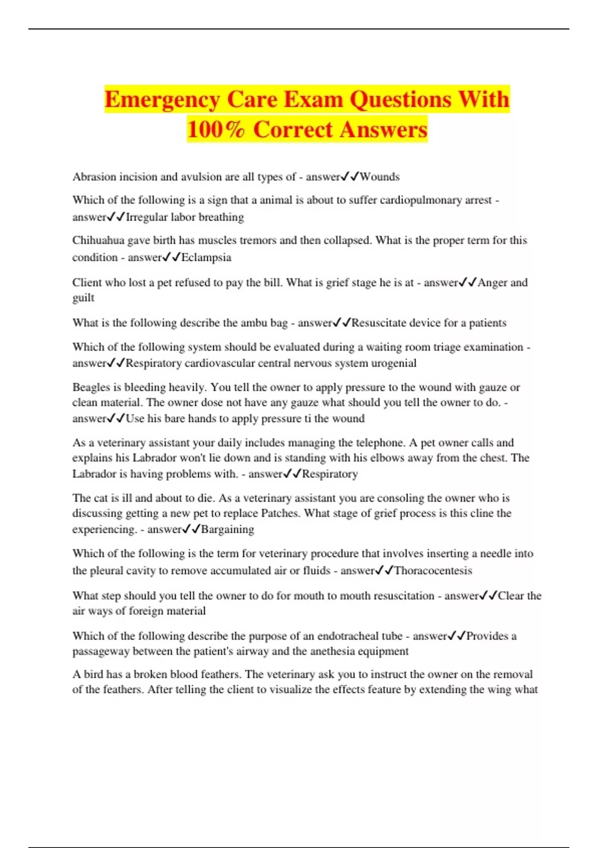 Emergency Care Exam Questions With 100% Correct Answers Abrasion incision and avulsion are all types of - answerWounds Which of the following is a sign that a animal is about to suffer cardiopulmonary arrest - answerIrregular labor breathing Chihuahua gave birth has muscles tremors and then collapsed. What is the proper term for this condition - answerEclampsia Client who lost a pet refused to pay the bill. What is grief stage he is at - answerAnger and guilt What is the following describe the ambu bag - answerResuscitate device for a patients Which of the following system should be evaluated during a waiting room triage examination - answerRespiratory cardiovascular central nervous system urogenial Beagles is bleeding heavily. You tell the owner to apply pressure to the wound with gauze or clean material. The owner dose not have any gauze what should you tell the owner to do. - answerUse his bare hands to apply pressure ti the wound As a veterinary assistant your daily includes managing the telephone. A pet owner calls and explains his Labrador won't lie down and is standing with his elbows away from the chest. The Labrador is having problems with. - answerRespiratory The cat is ill and about to die. As a veterinary assistant you are consoling the owner who is discussing getting a new pet to replace Patches. What stage of grief process is this cline the experiencing. - answerBargaining Which of the following is the term for veterinary procedure that involves inserting a needle into the pleural cavity to remove accumulated air or fluids - answerThoracocentesis What step should you tell the owner to do for mouth to mouth resuscitation - answerClear the air ways of foreign material Which of the following describe the purpose of an endotracheal tube - answerProvides a passageway between the patient's airway and the anethesia equipment A bird has a broken blood feathers. The veterinary ask you to instruct the owner on the removal of the feathers. After telling the client to visualize the effects feature by extending the wing what is the next step in removing the feather. - answerLoosen the attachement of the feather and surrounding skin A cat is present with severe trauma after being hit with a car The cat is cyanotic from a decrease in oxygen in the blood. Cyantotic means the animals and mucous membrane has turn a color - answerBlue or purple Which of the following term is used for period just before a seizure begins when an animal may act restless or nervous - answerAura A Great Dane present with gastric dilation volvulus and the veterinary begins to decompress the animal distend stomach in order to remove trapped air this procedure is known as - answerNeedle paracentesis Which of the following describes the purpose of emetics - answerProducing vomitting Body temperature mucous membrane color and increase heart rate are signs that the animal is - answerShock As part of a telephone triage you need to ask a owner to check the capillary refill time. Which of the following is a desirable length of time for a gun color to return to normal after being blanched. - answerOne to two second Client call to say she thinks that her dog broke her leg.Anita says apply splint to the leg. Pat say first apply a muzzles then splint to the leg. Who is correct. - answerBoth are correct What is the condition call when a animal - answerUrtheal obstruction What is nessarry for an effective animal who stop breathing to ensure there chance of survival - answerFluid emergency drugs and oxygen Describe the ABCs of life support - answerAirways Establishing a clear path for breathing. Breathing begin assist with venilization circulating feeling for a pulse Dyspneic - answerClinical term for a animal that have difficult breathing What are the basic equipment used in resuscitation - answerThe basic equipment used for resuscitation is endrotrachel laryphoscope and ambu bag Is it impossible to apply pressure for a wound wrap to tightly - answerYes it impossible to apply pressure to the wound on a short term basic What member is responsible for CPR efforts and a assigning task - answerThe member that is responsible for assisting the veterinarian and assigning task is the Veternarian Apnea - answerLack of breathing