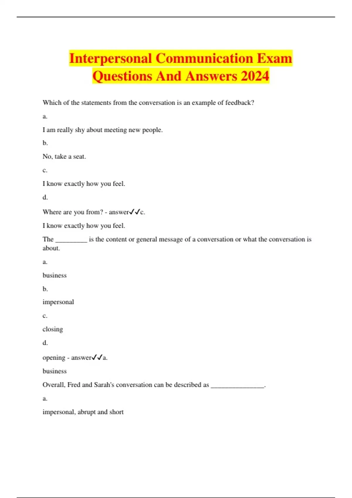 Interpersonal Communication Exam Questions And Answers 2024 Which of the statements from the conversation is an example of feedback? a. I am really shy about meeting new people. b. No, take a seat. c. I know exactly how you feel. d. Where are you from? - answerc. I know exactly how you feel. The _________ is the content or general message of a conversation or what the conversation is about. a. business b. impersonal c. closing d. opening - answera. business Overall, Fred and Sarah's conversation can be described as _______________. a. impersonal, abrupt and short