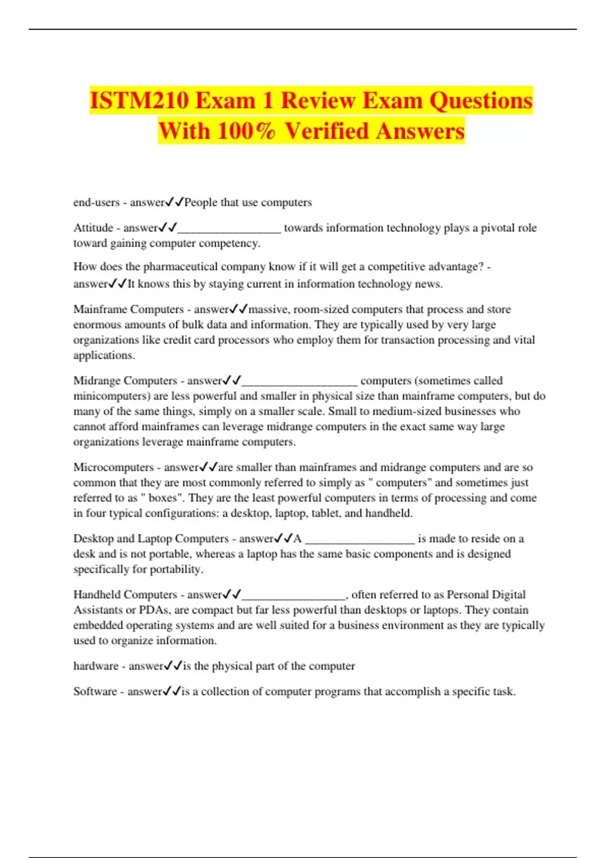 ISTM210 Exam 1 Review Exam Questions With 100% Verified Answers end-users - answerPeople that use computers Attitude - answer_________________ towards information technology plays a pivotal role toward gaining computer competency. How does the pharmaceutical company know if it will get a competitive advantage? - answerIt knows this by staying current in information technology news. Mainframe Computers - answermassive, room-sized computers that process and store enormous amounts of bulk data and information. They are typically used by very large organizations like credit card processors who employ them for transaction processing and vital applications. Midrange Computers - answer___________________ computers (sometimes called minicomputers) are less powerful and smaller in physical size than mainframe computers, but do many of the same things, simply on a smaller scale. Small to medium-sized businesses who cannot afford mainframes can leverage midrange computers in the exact same way large organizations leverage mainframe computers. Microcomputers - answerare smaller than mainframes and midrange computers and are so common that they are most commonly referred to simply as " computers" and sometimes just referred to as " boxes". They are the least powerful computers in terms of processing and come in four typical configurations: a desktop, laptop, tablet, and handheld. Desktop and Laptop Computers - answerA __________________ is made to reside on a desk and is not portable, whereas a laptop has the same basic components and is designed specifically for portability. Handheld Computers - answer_________________, often referred to as Personal Digital Assistants or PDAs, are compact but far less powerful than desktops or laptops. They contain embedded operating systems and are well suited for a business environment as they are typically used to organize information. hardware - answeris the physical part of the computer Software - answeris a collection of computer programs that accomplish a specific task. The most important aspect of system software is - answerwhen an operating system is enabled and becomes a platform for application software to work. operating system (OS), often called a platform - answeris a collection of computer programs that work together to manage hardware and software to ensure that they are working properly File management - answerOne of the most important jobs of an operating system is file management, that is, a way to store and organize files to the memory of a computer. graphical user interface (GUI) - answerthe inner workings of a physical filing cabinet that contains the file folders that house paper files. A file manager is a part of an operating system that a computer uses to display the filing system. Multitasking - answerIn the past, switching from one application program to another was a difficult and time-consuming task, as the computer system would only allow a user to run a single application at a time. If the user wanted to open a spreadsheet, but was already using a word processor, the user would have had to save the work in the word processor, turn it off, and then open the spreadsheet independently. This all changed with ______________ process - answerAny task a computer performs Memory Management - answerOperating systems coordinate a computer's memory which includes cache, random access memory (RAM), registers, and virtual memory. Simply put, memory holds data and information in an assortment of ways. Disk Management - answerAn OS is responsible for reading and writing data and information to a disk, typically a hard drive. Disk storage refers to non-volatile, secondary storage on a physical device like a hard drive or optical disk with a read/write apparatus. FAT - answerfile allocation table There are two basic categories of software - answerapplication software and system software Attitude - answeris as important as the software itself when learning a computing system. Object Linking and Embedding (OLE) - answerThe second and third methods of sharing information and data What law predicts that Google Earth will become Google Live? - answerMoore's Law What is the most important part of an information system? - answerPeople Does the average businessperson need to be an expert in IT? - answerNo What plays an import role when learning IT? - answerAttitude Acquiring technology when it is first introduced is called what? - answerBeing a Leader