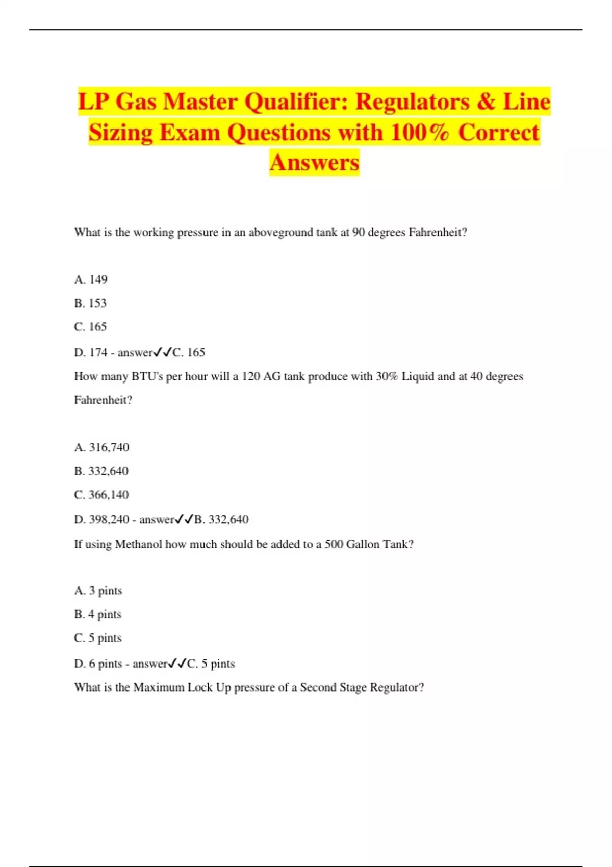 LP Gas Master Qualifier: Regulators & Line Sizing Exam Questions with 100% Correct Answers What is the working pressure in an aboveground tank at 90 degrees Fahrenheit? A. 149 B. 153 C. 165 D. 174 - answerC. 165 How many BTU's per hour will a 120 AG tank produce with 30% Liquid and at 40 degrees Fahrenheit? A. 316,740 B. 332,640 C. 366,140 D. 398,240 - answerB. 332,640 If using Methanol how much sho