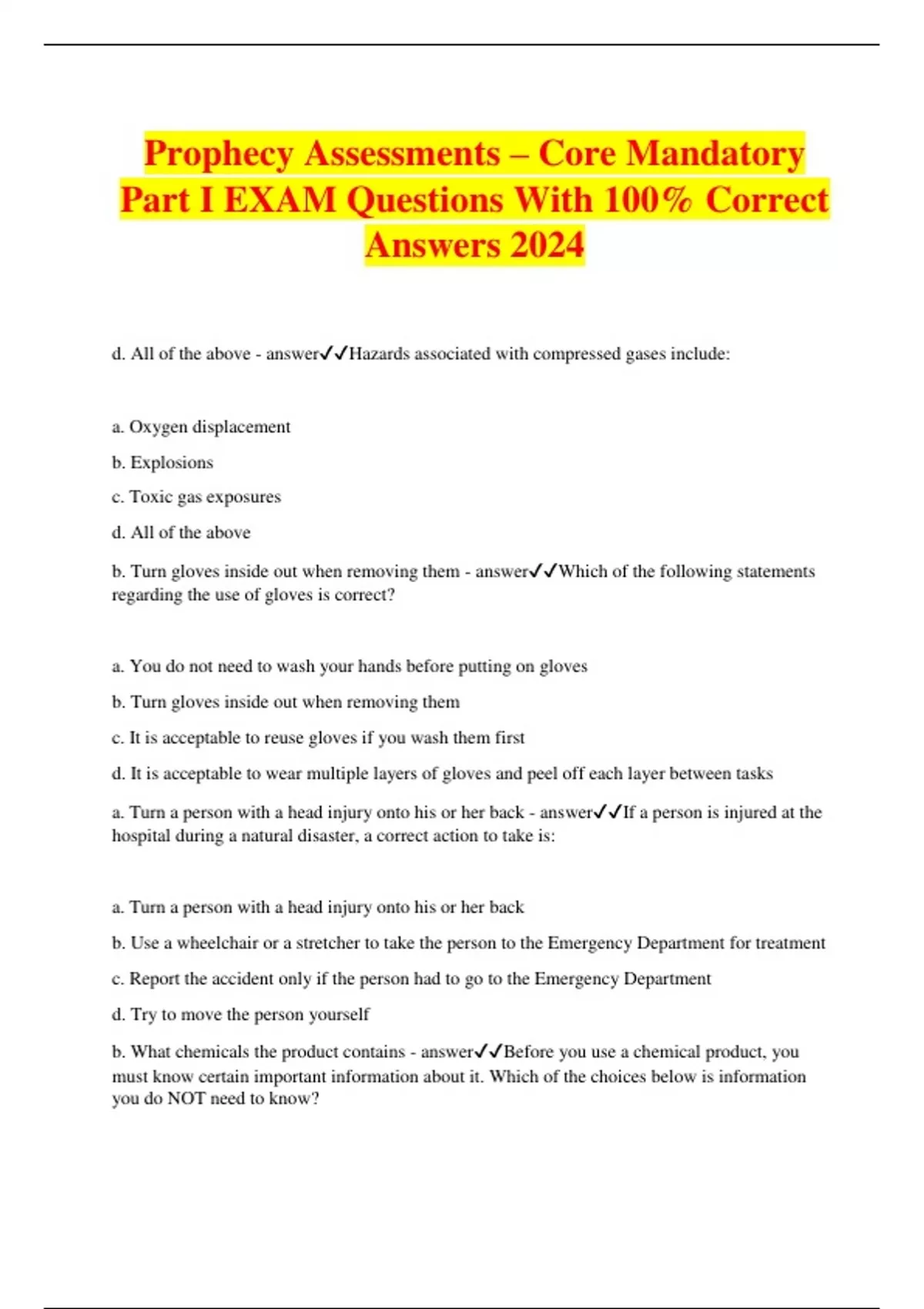 Prophecy Assessments – Core Mandatory Part I EXAM Questions With 100% Correct Answers 2024 d. All of the above - answerHazards associated with compressed gases include: a. Oxygen displacement b. Explosions c. Toxic gas exposures d. All of the above b. Turn gloves inside out when removing them - answerWhich of the following statements regarding the use of gloves is correct? a. You do not need to wash your hands before putting on gloves b. Turn gloves inside out when removing them c. It is acceptable to reuse gloves if you wash them first d. It is acceptable to wear multiple layers of gloves and peel off each layer between tasks a. Turn a person with a head injury onto his or her back - answerIf a person is injured at the hospital during a natural disaster, a correct action to take is: a. Turn a person with a head injury onto his or her back b. Use a wheelchair or a stretcher to take the person to the Emergency Department for treatment c. Report the accident only if the person had to go to the Emergency Department d. Try to move the person yourself b. What chemicals the product contains - answerBefore you use a chemical product, you must know certain important information about it. Which of the choices below is information you do NOT need to know? a. Proper use of the product b. What chemicals the product contains c. Treatment if accidentally exposed to it d. Precautions for safe handling d. All of the above - answerHealthcare workers who must comply with HIPAA privacy requirements are: a. Doctors, nurses, and others providing direct patient care b. Environmental Services staff c. Engineering staff d. All of the above b. Your facility's name - answerWhich of the following is NOT required on a chemical label? a. A signal word b. Your facility's name c. A hazard statement d. A pictogram a. How to use a fire extinguisher - answerThe acronym P.A.S.S. is used to help remember: a. How to use a fire extinguisher b. How to evacuate patients c. How to spread the word about a fire d. None of the above d. Legs - answerWhen lifting something off the ground, which part of your body should you always use? a. Back b. Abdominals c. Arms d. Legs a. Do not roll equipment over electrical cords because it can damage the cord - answerWhich of the following statements regarding electrical safety is correct? a. Do not roll equipment over electrical cords because it can damage the cord b. It is acceptable to use a plug with a loose or broken pin as long as the device works c. Adaptors that convert three-pin plugs to two-pin plugs are safe to use d. Equipment should be unplugged by pulling the cord, not the plug a. Wear appropriate Personal Protective Equipment (PPE) such as gowns and gloves - answerPlacing a patient on Contact Precautions means that everyone must: a. Wear appropriate Personal Protective Equipment (PPE) such as gowns and gloves b. Wear a respirator c. Care for the patient in an airborne infection isolation room (AIIR) d. All of the above d. All of the above - answerWhen mobilizing a weak or unsteady patient, which technique(s) should you consider? a. Using a transfer belt (gait belt) b. Using a mechanical lift, roller board, sliding board, flexible patient mover, or sling c. Having an assistant help you d. All of the above d. Bomb threat - answerWhich of the following would be considered an internal disaster rather than an external one? a. Earthquake b. Hurrican