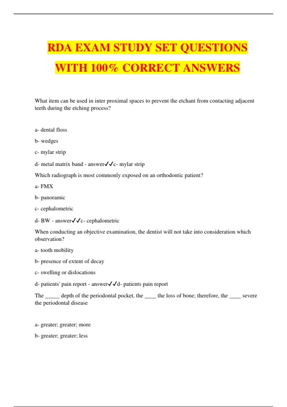 RDA EXAM STUDY SET QUESTIONS WITH 100% CORRECT ANSWERS What item can be used in inter proximal spaces to prevent the etchant from contacting adjacent teeth during the etching process? a- dental floss b- wedges c- mylar strip d- metal matrix band - answerc- mylar strip Which radiograph is most commonly exposed on an orthodontic patient? a- FMX b- panoramic c- cephalometric d- BW - answerc- cephalometric When conducting an objective examination, the dentist will not take into consideration which observation? a- tooth mobility b- presence of extent of decay c- swelling or dislocations d- patients' pain report - answerd- patients pain report The _____ depth of the periodontal pocket, the ____ the loss of bone; therefore, the ____ severe the periodontal disease a- greater; greater; more b- greater; greater; less c- lesser; lesser; more d- lesser; greater; less - answera- greater; greater; more The highest risk period of decay occurs within the first ____ years of eruption a- 3 b-2 c- 7 d- 9 - answera- 3 What prosthesis is placed immediately after the extraction of the patients remaining anterior teeth? a- overdenture b- immediate denture c- partial denture d- duplicate denture - answerb- immediate denture Traumatic _____ occurs when the injured tooth has been forced inward. a- avulsion b- extrusion c- intrusion d- luxation - answerc- intrusion What is an advantage of using the patient's model to select bands? a- The patient does not need to be present b- It is more accurate c- Neither are advantages d- Both are advantages - answera- the patient does not need to be present How often does the American Academy of Pediatric Dentistry recommend that radiographic imaging be performed for children at high risk for tooth decay? a- 3 months b- 6 months c-12 months - answerb- 6 months What is the area surrounding the mouth called? a- circumoral b- endosteal c- subperiosteal d- transosteal - answera- circumoral Retention of a maxillary denture depends on the suction seal from which element? a- flange b- palatal suction c- post dam d- border molding - answerc- post dam A right-handed operator generally begins seated at ____ o'clock and a left-handed operator at _____ o'clock. - answer8; 3 An incisional biopsy is indicated when he lesion is what size? a- larger than 1mm in all dimensions b- larger than 1 cm in all dimensions c- located in an area that would be cosmetically or functionally impaired by surgery d- both b and c - answerd- both b and c Simple repairs of broken denture acrylic are sometimes handled in the dental office laboratory by using which material? a- gluteraldeyde b- cold-cured acrylic c- palodent d- eugenol - answerb- cold-cured acrylic The two types of tests that the dentist uses to determine whether the inflammatory process has gone into the periapical tissues are ____ and ____. a- objective; subjective b- palpation; percussion c- chronic; acute d- reversible; irreversible - answerb- palpation; percussion What is the advantage of using preformed crowns for provisional coverage? a- it reduces time required for the procedures b- Preformed shells comes with anatomic features of natural teeth c- monomer setting time is less than 90 seconds d- both a and b are advantages - answerd- both a and b are advantages How long is the healing period for the first osseointegrated implant surgery? - answer1-2 weeks Which factors can cause pulpal nerve damage? a- physical irritation b- trauma c- poor nutritional health d- both a and b - answerd- both a and b If the liquid or powder acrylic material is being used for the provisional, how many drops of liquid are used? a- 5