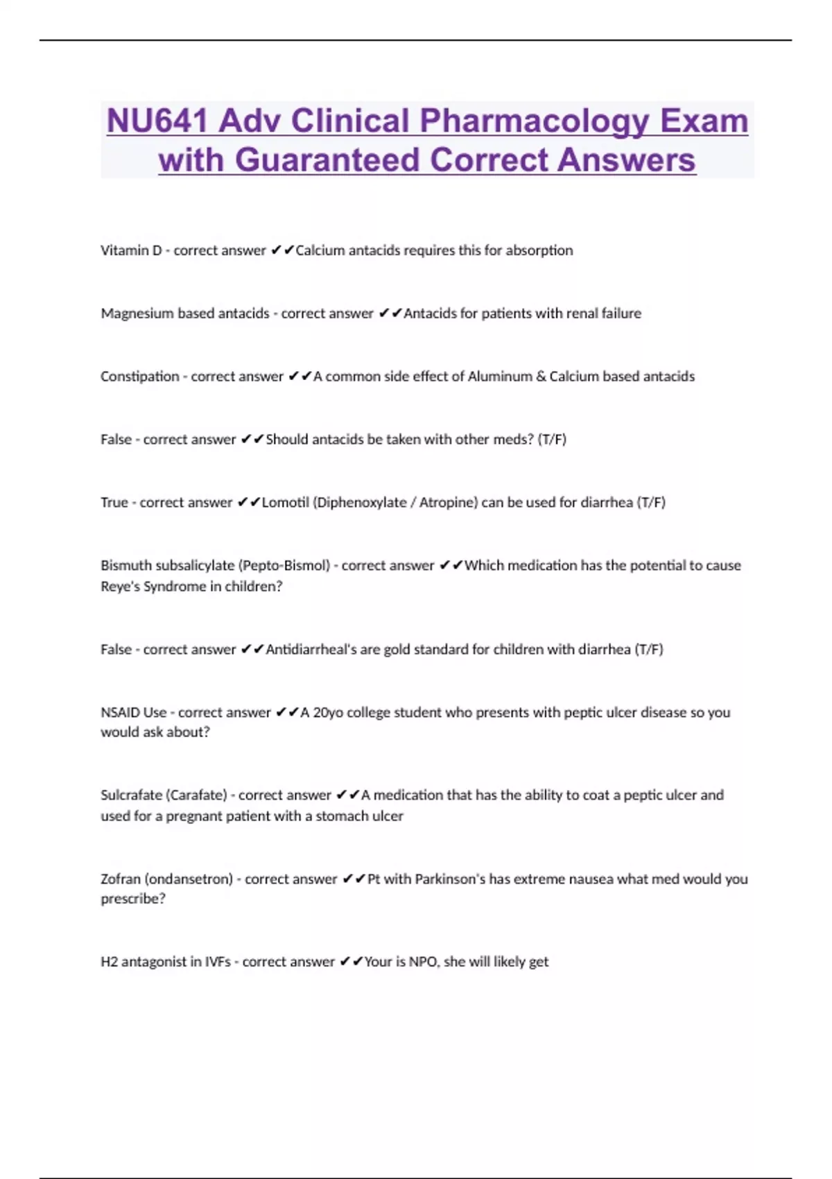Vitamin D - correct answer Calcium antacids requires this for absorption Magnesium based antacids - correct answer Antacids for patients with renal failure Constipation - correct answer A common side effect of Aluminum & Calcium based antacids False - correct answer Should antacids be taken with other meds? (T/F) True - correct answer Lomotil (Diphenoxylate / Atropine) can be used for diarrhea (T/F) Bismuth subsalicylate (Pepto-Bismol) - correct answer Which medication has the potential to cause Reye's Syndrome in children? False - correct answer Antidiarrheal's are gold standard for children with diarrhea (T/F) NSAID Use - correct answer A 20yo college student who presents with peptic ulcer disease so you would ask about? Sulcrafate (Carafate) - correct answer A medication that has the ability to coat a peptic ulcer and used for a pregnant patient with a stomach ulcer Zofran (ondansetron) - correct answer Pt with Parkinson's has extreme nausea what med would you prescribe? H2 antagonist in IVFs - correct answer Your is NPO, she will likely get