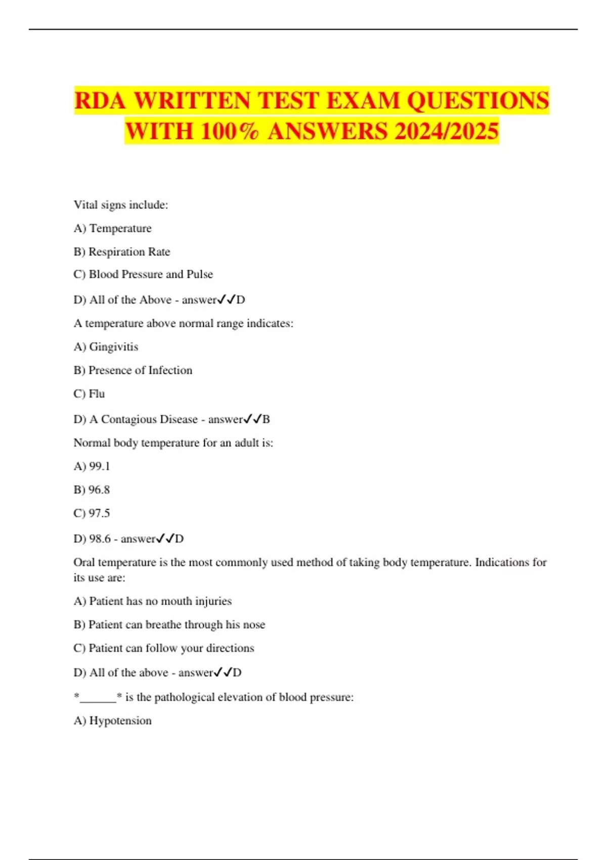 RDA WRITTEN TEST EXAM QUESTIONS WITH 100% ANSWERS 2024/2025 Vital signs include: A) Temperature B) Respiration Rate C) Blood Pressure and Pulse D) All of the Above - answerD A temperature above normal range indicates: A) Gingivitis B) Presence of Infection C) Flu D) A Contagious Disease - answerB Normal body temperature for an adult is: A) 99.1 B) 96.8 C) 97.5 D) 98.6 - answerD Oral temperature is the most commonly used method of taking body temperature. Indications for its use are: A) Patient has no mouth injuries B) Patient can breathe through his nose C) Patient can follow your directions D) All of the above - answerD *______* is the pathological elevation of blood pressure: A) Hypotension B) Hypertension C) Hyperactivity D) Hyperglycemia - answerB The normal pulse rate for a child is: A) 80-100 B) 80 C) 100 or higher D) 60-80 - answerA Factors which could affect one's pulse are: A) Fasting B) Emergency Situations C) Stimulants D) All of the above - answerD Normal adult pulse range is: A) 60-80 per minute B) 60-80 per hour C) 100 per minute D) 25 per minute - answerA At which of the following points on the body can you feel a patients pulse? A) Radial B) Brachial C) Temporal D) All of the above - answerD When taking a patients pulse, the following steps should be followed: A) Tell the patient what is happening B) Count the pulse for one minute C) Record on the patients chart D) All of the above - answerD The most common place to take a patients pulse is on the wrist. This location is called the: A) Common B) Radial C) Brachial D) Medial - answerB Characteristics of respiration would include: A) Rate B) Rhythm C) Depth D) All of the above - answerD Normal respiration rate for an adult is: A) 20-30 per minute B) 15 per minute C) 14-20 per minute D) None of the above - answerC Blood pressure consists of two components. These are: A) Systolic and cardiac B) Cardiac and diastolic C) Systolic and Diastolic D) None of the above - answerC The pressure measuring the highest, or peak pressure, is called: A) Systolic B) Diastolic C) Cardiac D) Bulimic - answerA The measurement of the lowest pressure is: A) Systolic B) Diastolic C) Cardiac D) Bulimic - answerB When listening to the pulsing sounds of blood pressure, the *_____* is when the pressure stops pulsing and cannot be heard: A) Diastolic B) Bulimic C) Cardiac D) Systolic - answerD Factors affecting blood pressure are: A) Emotional disturbance B) Stress C) Eating D) All of the above - answerD The equipment necessary to take a blood pressure would include: A) Stethoscope and sphygamoral B) Thermometer and stethoscope C) Stethoscope and sphygmomanometer D) Sphygmomanometer and thermomometer - answerC When taking a patients blood pressure, you must do all of the following: A) Seat the patient with their head lower than their heart B) Apply the cuff over clothing to protect skin C) None of the above are true D) A and B are true - answerC The *_______* is the first tap sound you hear when taking a blood pressure: A) Diastolic pressure B) Systolic pressure C) Cardiac pressure D) Bulimic pressure - answerB