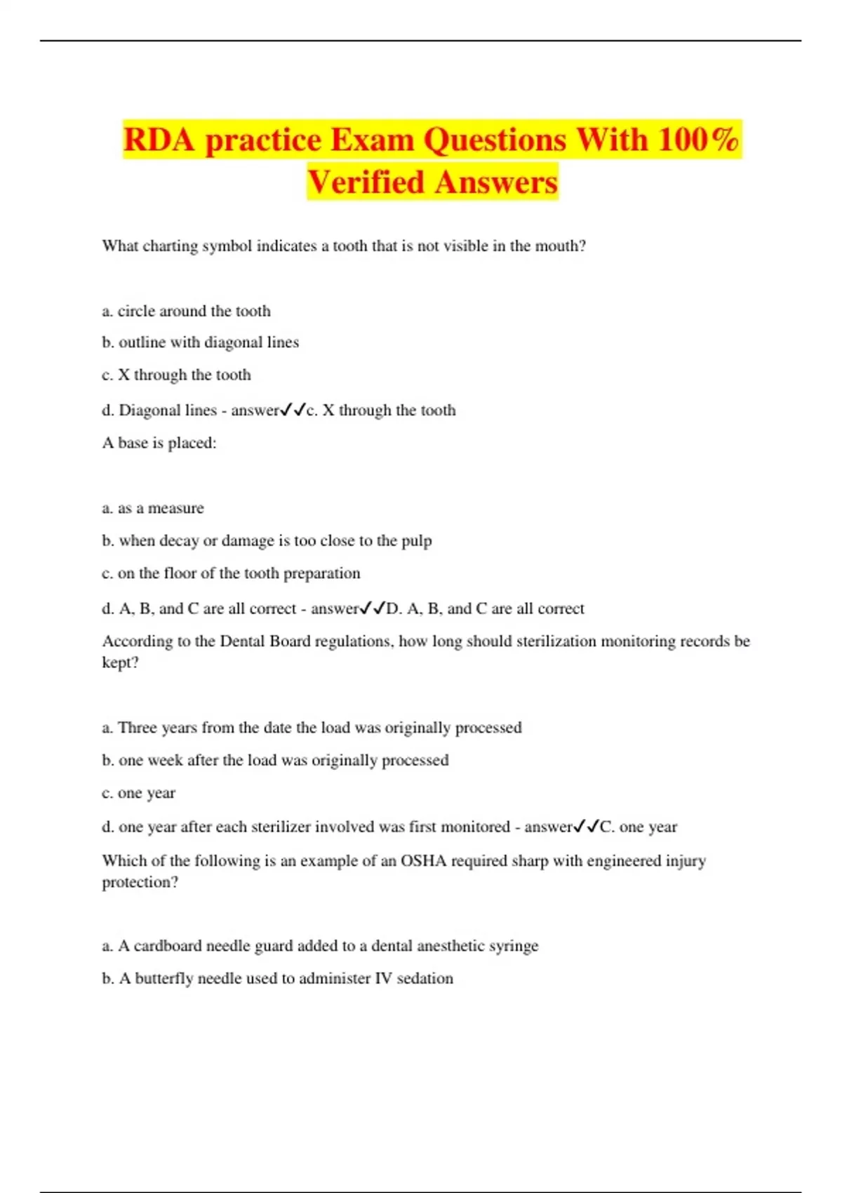 RDA practice Exam Questions With 100% Verified Answers What charting symbol indicates a tooth that is not visible in the mouth? a. circle around the tooth b. outline with diagonal lines c. X through the tooth d. Diagonal lines - answerc. X through the tooth A base is placed: a. as a measure b. when decay or damage is too close to the pulp c. on the floor of the tooth preparation d. A, B, and C are all correct - answerD. A, B, and C are all correct According to the Dental Board regulations, how long should sterilization monitoring records be kept? a. Three years from the date the load was originally processed b. one week after the load was originally processed c. one year d. one year after each sterilizer involved was first monitored - answerC. one year Which of the following is an example of an OSHA required sharp with engineered injury protection? a. A cardboard needle guard added to a dental anesthetic syringe b. A butterfly needle used to administer IV sedation c. A self-sheathing needle attached to a dental anesthetic syringe d. A needle cap holder built into a instrument cassette - answerC. A self-sheathing needle attached to a dental anesthetic syringe The air/water syringe is primarily used during the coronal polishing procedure to: a. irrigate the oral cavity b. dry the tooth surface c. encourage drying of the mucosa d. remove the remaining paste - answerD. remove the remaining paste Which of the following should be performed FIRST if an adult patient does not have a pulse? a. Call for emergency assistance b. Administer oxygen c. Call the patients medical doctor d. Administer CPR - answerA. Call for emergency assistance Oral surgical procedures require the use of ______? a. Chemical agents to disinfect the water and the water lines b. Sterile irrigating solutions using a sterile delivery system c. Water that meets the Food and Drug Administration (FDA) surface water standards d. Water that meets Environmental Protection Agency (EPA) drinking water standards - answerB. Sterile irrigating solutions using a sterile delivery system When setting up an instrument tray or cassette, the instruments should bet set up _________? a. from right to left? b. from left to right? c. from top to bottom? d. from bottom to top? - answerB. from left to right Who legally owns a patient's dental radiographs? a. The patient b. The radiologist c. The dentist d. The physician - answerC. The dentist Calcium Hydroxide is used in dentistry as a _________? a. base b. liner c. matrix d. All of the above answers are correct - answerB. Liner Prior to sterilization, loose contaminated instruments are processed in an ultrasonic cleaner to __________? a. clean then disinfect b. remove all microorganisms c. remove debris and bio-burden d. disinfect then clean - answerC. remove debris and bio-burden A critical step for healthcare workers in preventing the spread of disease is proper hygiene of one's _____? a. hair b. eyes c. face d. hands - answerD. hands The purpose of dental sealants is ____? a. to prevent decay from spreading? b. to prevent decay in the pits and fissures of teeth c. to promote good oral health d. to prevent decay from interproximal spaces - answerB. to prevent decay in the pits and fissures of teeth Elevating the patient's feet above the head to increase blood flow to the brain is the response to what medical condition?