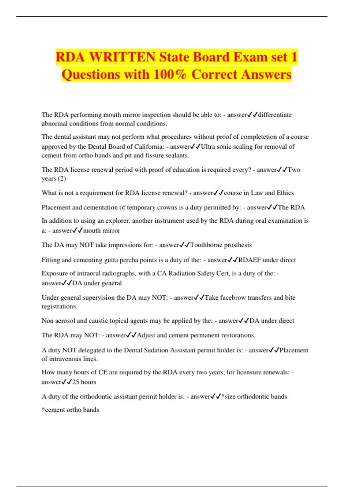 RDA WRITTEN State Board Exam set 1 Questions with 100% Correct Answers
