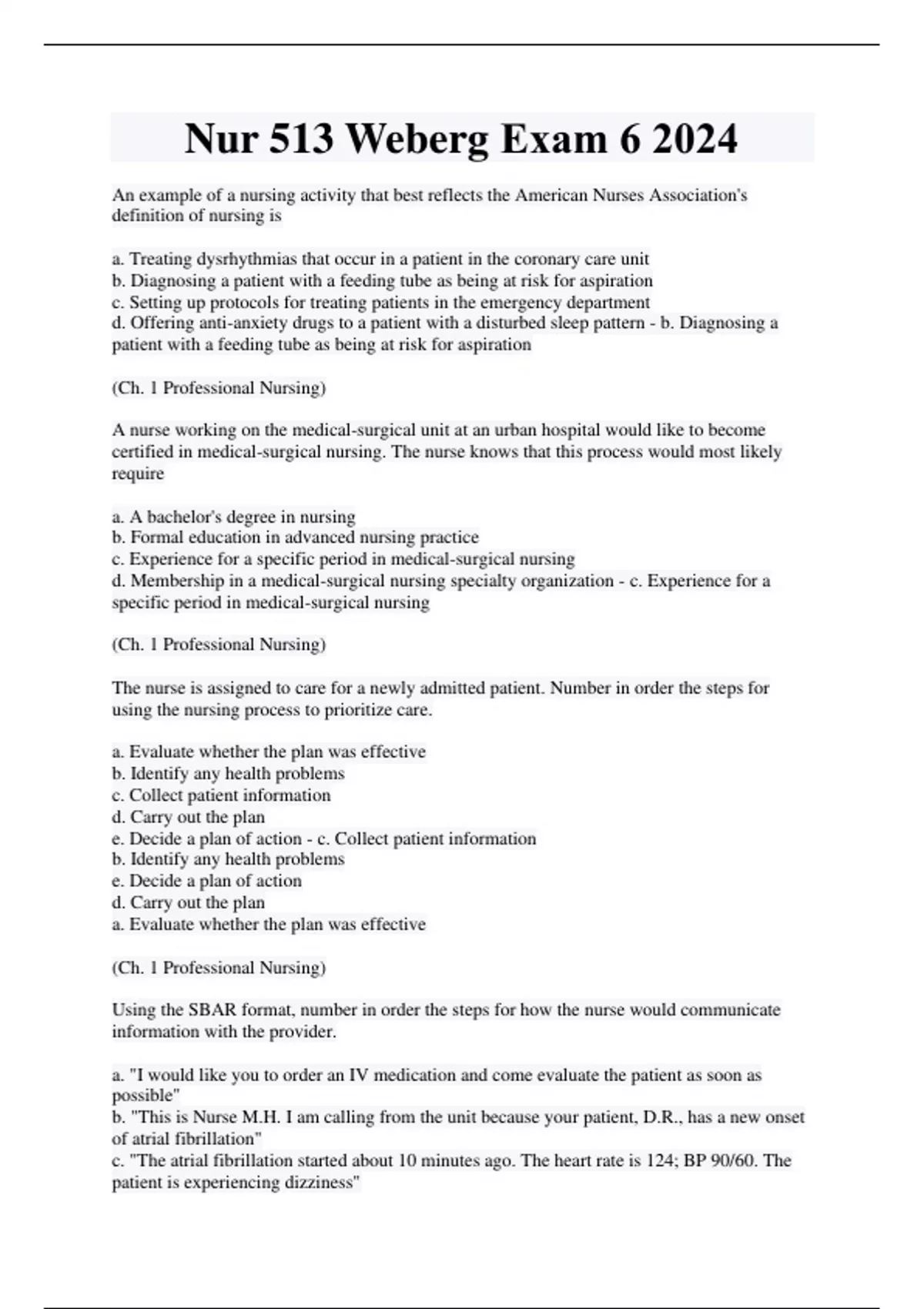 An example of a nursing activity that best reflects the American Nurses Association's definition of nursing is a. Treating dysrhythmias that occur in a patient in the coronary care unit b. Diagnosing a patient with a feeding tube as being at risk for aspiration c. Setting up protocols for treating patients in the emergency department d. Offering anti-anxiety drugs to a patient with a disturbed sleep pattern - b. Diagnosing a patient with a feeding tube as being at risk for aspiration (Ch. 1 Professional Nursing) A nurse working on the medical-surgical unit at an urban hospital would like to become certified in medical-surgical nursing. The nurse knows that this process would most likely require a. A bachelor's degree in nursing b. Formal education in advanced nursing practice c. Experience for a specific period in medical-surgical nursing d. Membership in a medical-surgical nursing specialty organization - c. Experience for a specific period in medical-surgical nursing (Ch. 1 Professional Nursing) The nurse is assigned to care for a newly admitted patient. Number in order the steps for using the nursing process to prioritize care. a. Evaluate whether the plan was effective b. Identify any health problems c. Collect patient information d. Carry out the plan e. Decide a plan of action - c. Collect patient information b. Identify any health problems e. Decide a plan of action d. Carry out the plan a. Evaluate whether the plan was effective (Ch. 1 Professional Nursing) Using the SBAR format, number in order the steps for how the nurse would communicate information with the provider. a. "I would like you to order an IV medication and come evaluate the patient as soon as possible" b. "This is Nurse M.H. I am calling from the unit because your patient, D.R., has a new onset of atrial fibrillation" c. "The atrial fibrillation started about 10 minutes ago. The heart rate is 124; BP 90/60. The patient is experiencing dizziness" d. "D.R., who is 2 days postoperative for a bowel resection for diverticulitis, has a history of mitral valve disease" - b. "This is Nurse M.H. I am calling from the unit because your patient, D.R., has a new onset of atrial fibrillation" d. "D.R., who is 2 days postoperative for a bowel resection for diverticulitis, has a history of mitral valve disease" c. "The atrial fibrillation started about 10 minutes ago. The heart rate is 124; BP 90/60. The patient is experiencing dizziness" a. "I would like you to order an IV medication and come evaluate the patient as soon as possible" (Ch. 1