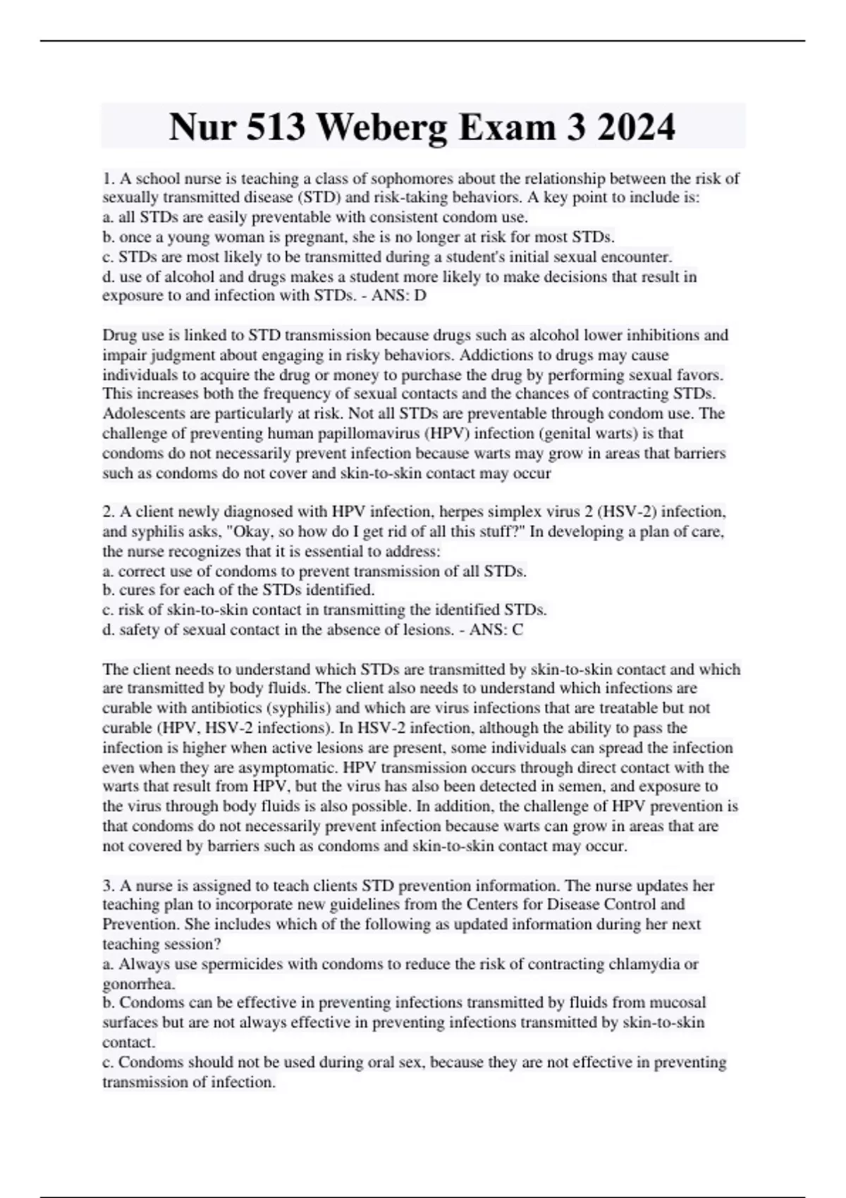 1. A school nurse is teaching a class of sophomores about the relationship between the risk of sexually transmitted disease (STD) and risk-taking behaviors. A key point to include is: a. all STDs are easily preventable with consistent condom use. b. once a young woman is pregnant, she is no longer at risk for most STDs. c. STDs are most likely to be transmitted during a student's initial sexual encounter. d. use of alcohol and drugs makes a student more likely to make decisions that result in exposure to and infection with STDs. - ANS: D Drug use is linked to STD transmission because drugs such as alcohol lower inhibitions and impair judgment about engaging in risky behaviors. Addictions to drugs may cause individuals to acquire the drug or money to purchase the drug by performing sexual favors. This increases both the frequency of sexual contacts and the chances of contracting STDs. Adolescents are particularly at risk. Not all STDs are preventable through condom use. The challenge of preventing human papillomavirus (HPV) infection (genital warts) is that condoms do not necessarily prevent infection because warts may grow in areas that barriers such as condoms do not cover and skin-to-skin contact may occur 2. A client newly diagnosed with HPV infection, herpes simplex virus 2 (HSV-2) infection, and syphilis asks, "Okay, so how do I get rid of all this stuff?" In developing a plan of care, the nurse recognizes that it is essential to address: a. correct use of condoms to prevent transmission of all STDs. b. cures for each of the STDs identified. c. risk of skin-to-skin contact in transmitting the identified STDs. d. safety of sexual contact in the absence of lesions. - ANS: C The client needs to understand which STDs are transmitted by skin-to-skin contact and which are transmitted by body fluids. The client also needs to understand which infections are curable with antibiotics (syphilis) and which are virus infections that are treatable but not curable (HPV, HSV-2 infections). In HSV-2 infection, although the ability to pass the infection is higher when active lesions are present, some individuals can spread the infection even when they are asymptomatic. HPV transmission occurs through direct contact with the warts that result from HPV, but the virus has also been detected in semen, and exposure to the virus through body fluids is also possible. In addition, the challenge of HPV prevention is that condoms do not necessarily prevent infection because warts can grow in areas that are not covered by barriers such as condoms and skin-to-skin contact may occur. 3. A nurse is assigned to teach clients STD prevention information. The nurse updates her teaching plan to incorporate new guidelines from the Centers for Disease Control and Prevention. She includes which of the following as updated information during her next teaching session? a. Always use spermicides with condoms to reduce the risk of contracting chlamydia or gonorrhea. b. Condoms can be effective in preventing infections transmitted by fluids from mucosal surfaces but are not always effective in preventing infections transmitted by skin-to-skin contact. c. Condoms should not be used during oral sex, because they are not effective in preventing transmission of infection. d. When genital ulcers are present, condoms should be used to prevent the spread of infection. - ANS: B The lesions of HSV-2 and HPV infection as well as other lesions capable of transmitting STDs can occur on all parts of the male and female genitalia and rectum. Condoms are effective in reducing transmission via body fluids from the penis and vagina. However, lesions not covered by a male or female condom can still transmit infection even with proper condom use 4. A woman comes to the community health center complaining of increasing lower abdominal pain, fever, and abnormal menses for several months. During the assessment, the