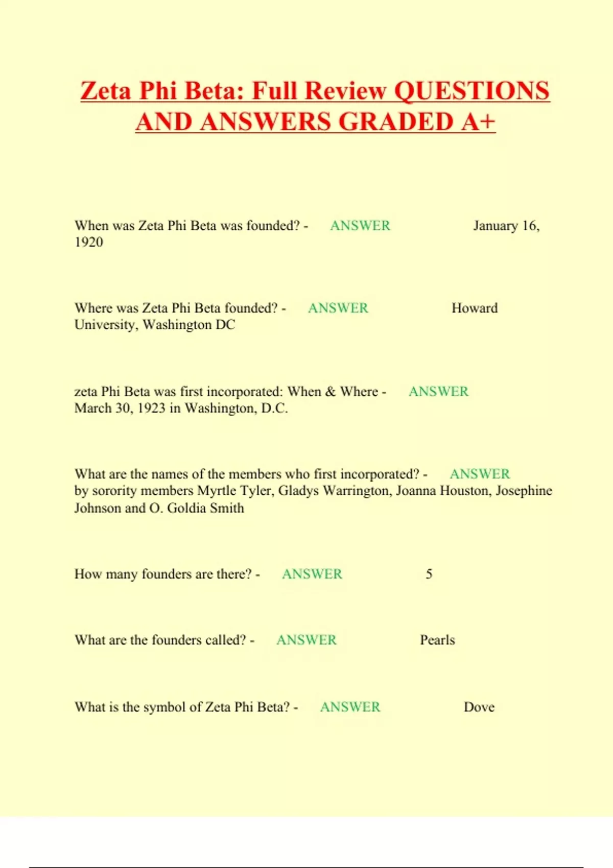 Zeta Phi Beta: Full Review QUESTIONS AND ANSWERS GRADED A+ When was Zeta Phi Beta was founded? - ANSWER January 16, 1920 Where was Zeta Phi Beta founded? - ANSWER Howard University, Washington DC zeta Phi Beta was first incorporated: When & Where - ANSWER March 30, 1923 in Washington, D.C. What are the names of the members who first incorporated? - ANSWER by sorority members Myrtle Tyler, Gladys Warrington, Joanna Houston, Josephine Johnson and O. Goldia Smith How many founders are there? - ANSWER 5 What are the founders called? - ANSWER Pearls What is the symbol of Zeta Phi Beta? - ANSWER Dove