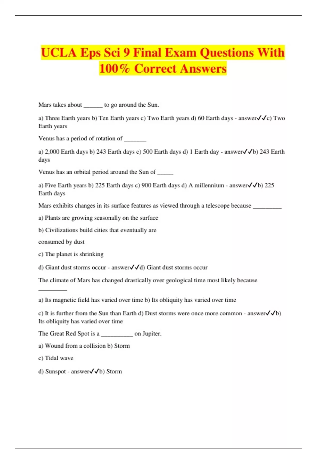 UCLA Eps Sci 9 Final Exam Questions With 100% Correct Answers Mars takes about ______ to go around the Sun. a) Three Earth years b) Ten Earth years c) Two Earth years d) 60 Earth days - answerc) Two Earth years Venus has a period of rotation of _______ a) 2,000 Earth days b) 243 Earth days c) 500 Earth days d) 1 Earth day - answerb) 243 Earth days Venus has an orbital period around the Sun of _____ a) Five Earth years b) 225 Earth days c) 900 Earth days d) A millennium - answerb) 225 Earth days Mars exhibits changes in its surface features as viewed through a telescope because _________ a) Plants are growing seasonally on the surface b) Civilizations build cities that eventually are consumed by dust c) The planet is shrinking d) Giant dust storms occur - answerd) Giant dust storms occur The climate of Mars has changed drastically over geological time most likely because _________ a) Its magnetic field has varied over time b) Its obliquity has varied over time c) It is further from the Sun than Earth d) Dust storms were once more common - answerb) Its obliquity has varied over time The Great Red Spot is a __________ on Jupiter. a) Wound from a collision b) Storm c) Tidal wave d) Sunspot - answerb) Storm Belts on Jupiter are _______________. a) Warm, red low-altitude clouds b) Cool, white high-altitude clouds c) Regions of water frost d) Regions of metallic He - answera) Warm, red low-altitude clouds The deep parts of the gas giant planets are composed of _______. a) Metallic He b) Metallic H liquid c) Metallic Li d) Metallic Fe - answerb) Metallic H liquid Saturn moved __________ during the "Grand Tack". a) Inward towards the Sun b) Outward away from the Sun c) Sideways d) Inward then outward - answerd) Inward then outward The diamond anvil cell is used to learn about _________ a) The nature of materials are great depths within planets b) The nature of materials high in the atmosphere of planets c) The origin of diamonds d) Low-pressure physics - answera) The nature of materials at great depths within planets The four Galilean moons around Jupiter are _______ a) Callisto, Triton, Io, and Europa b) Callisto, Titania, Europa, and Triton c) Callisto, Ganymede, Europa, and Io d) Titan, Ganymede, Europa, and Titania - answerc) Callisto, Ganymede, Europa, and Io The Moon formed as a result of ______________ a) A giant piece of the Pacific ocean spawling off the Earth b) Capture of an asteroid by Earth c) The late heavy bombardment d) A massive collision between proto-Earth and a planetary embryo - answerd) A massive collision between proto-Earth and a planetary embryo