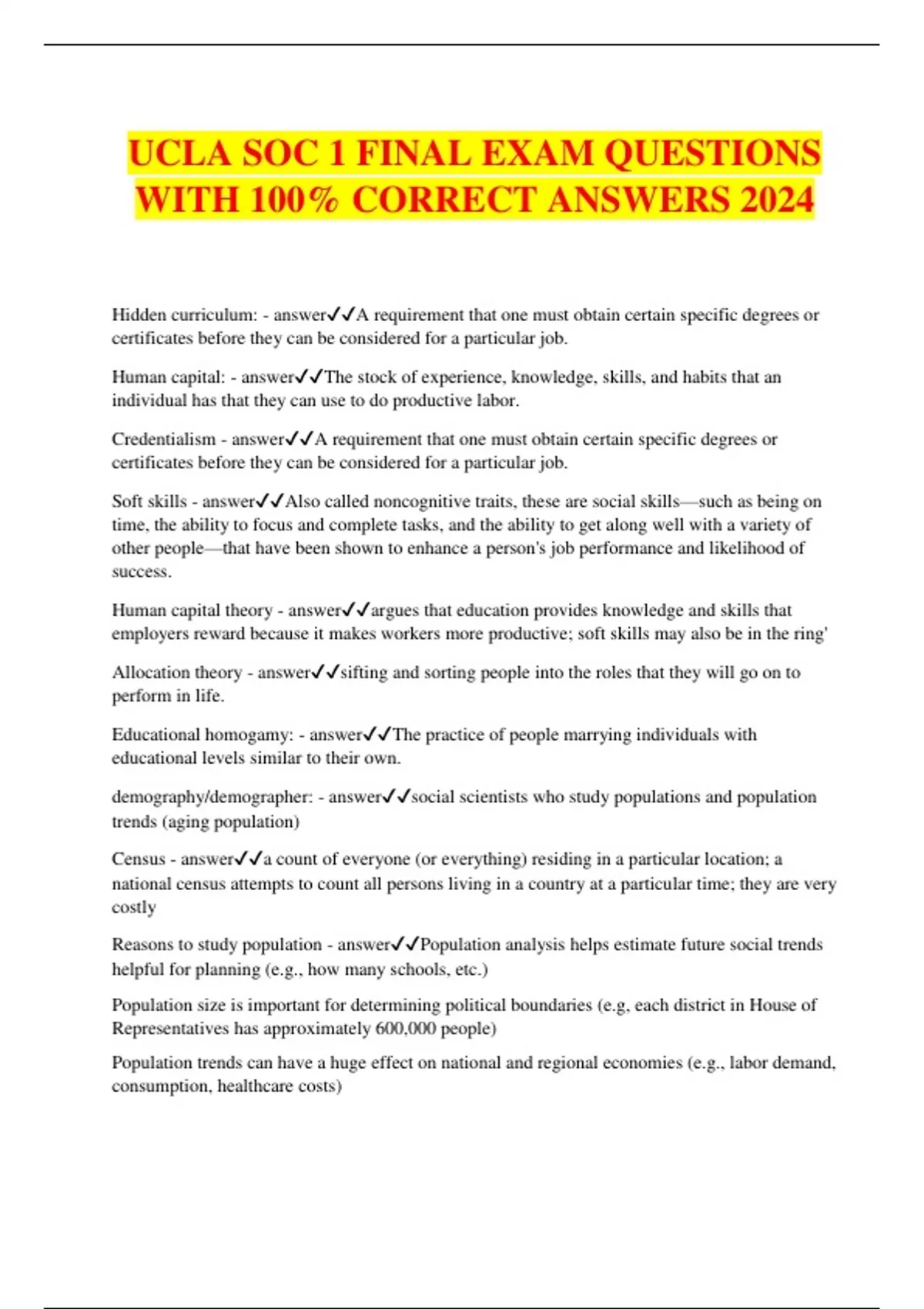 UCLA SOC 1 FINAL EXAM QUESTIONS WITH 100% CORRECT ANSWERS 2024 Hidden curriculum: - answerA requirement that one must obtain certain specific degrees or certificates before they can be considered for a particular job. Human capital: - answerThe stock of experience, knowledge, skills, and habits that an individual has that they can use to do productive labor. Credentialism - answerA requirement that one must obtain certain specific degrees or certificates before they can be considered for a particular job. Soft skills - answerAlso called noncognitive traits, these are social skills—such as being on time, the ability to focus and complete tasks, and the ability to get along well with a variety of other people—that have been shown to enhance a person's job performance and likelihood of success. Human capital theory - answerargues that education provides knowledge and skills that employers reward because it makes workers more productive; soft skills may also be in the ring' Allocation theory - answersifting and sorting people into the roles that they will go on to perform in life. Educational homogamy: - answerThe practice of people marrying individuals with educational levels similar to their own. demography/demographer: - answersocial scientists who study populations and population trends (aging population) Census - answera count of everyone (or everything) residing in a particular location; a national census attempts to count all persons living in a country at a particular time; they are very costly Reasons to study population - answerPopulation analysis helps estimate future social trends helpful for planning (e.g., how many schools, etc.) Population size is important for determining political boundaries (e.g, each district in House of Representatives has approximately 600,000 people) Population trends can have a huge effect on national and regional economies (e.g., labor demand, consumption, healthcare costs) Fertility - answerbirth rate is typically measured by the number of live births per woman of childbearing years Mortality - answerDEATH RATE Migration - answerthe movement into and out of a region or country Total fertility rate - answerdefined by the number of children an average woman has in her lifetime Replacement fertility: - answerthe number of children per woman necessary to replace the population; about 2.1 children per woman Age pyramids: - answerplot the size of the population in each age group for men and women; lower age groups are at the bottom Population momentum - answerOccurs because the cohort of women of childbearing age may still be large or growing even though the fertility rate declined. Epidemiology - answerthe study of health-related events in populations, their characteristics, their causes, and their consequences Epidemiological transition: - answerrefers to the transition of a population from health conditions primarily involving infectious disease... to health conditions primarily involving chronic disease "Baby boom" - answerrefers to the period following World War II from 1946 to 1964, during which the U.S. experienced a temporary spike in fertility Cohort - answerrefers to persons born during the same time period Life expectancy - answerthe average number of years that a population at some age can expect to live Megacity - answercities with populations over 10 million like mexico city Megaregion - answerformed when two or more large cities in geographical proximity are linked together through infrastructure and through economic activity Suburb - answerare areas within metropolitan regions but outside the political boundaries of central cities; fostered by government subsidies for home ownership and highway construction Redlining - answerpredominantly black or racially mixed neighborhoods were outlined in red on maps Suburban sprawl - answerresults from the stretching out of suburban boundaries