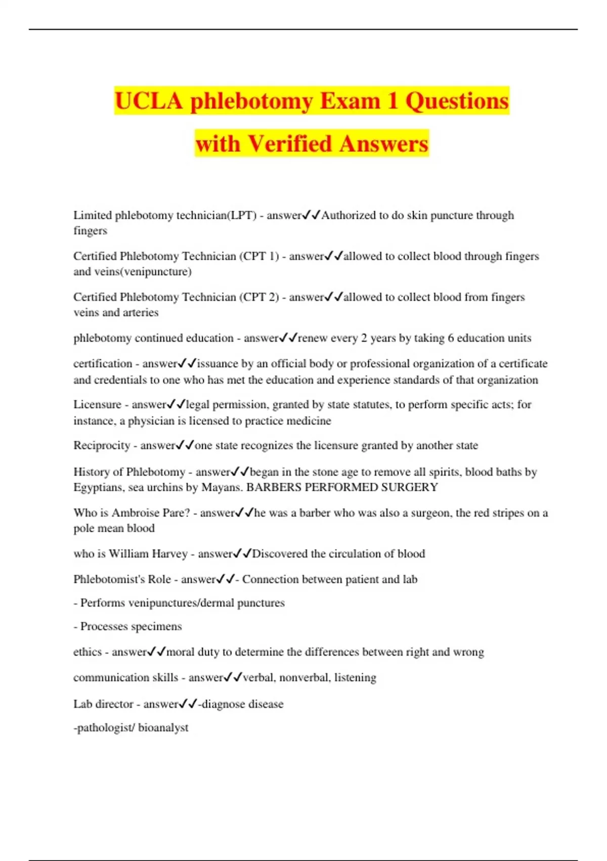 UCLA phlebotomy Exam 1 Questions with Verified Answers Limited phlebotomy technician(LPT) - answerAuthorized to do skin puncture through fingers Certified Phlebotomy Technician (CPT 1) - answerallowed to collect blood through fingers and veins(venipuncture) Certified Phlebotomy Technician (CPT 2) - answerallowed to collect blood from fingers veins and arteries phlebotomy continued education - answerrenew every 2 years by taking 6 education units certification - answerissuance by an official body or professional organization of a certificate and credentials to one who has met the education and experience standards of that organization Licensure - answerlegal permission, granted by state statutes, to perform specific acts; for instance, a physician is licensed to practice medicine Reciprocity - answerone state recognizes the licensure granted by another state History of Phlebotomy - answerbegan in the stone age to remove all spirits, blood baths by Egyptians, sea urchins by Mayans. BARBERS PERFORMED SURGERY Who is Ambroise Pare? - answerhe was a barber who was also a surgeon, the red stripes on a pole mean blood who is William Harvey - answerDiscovered the circulation of blood Phlebotomist's Role - answer- Connection between patient and lab - Performs venipunctures/dermal punctures - Processes specimens ethics - answermoral duty to determine the differences between right and wrong communication skills - answerverbal, nonverbal, listening Lab director - answer-diagnose disease -pathologist/ bioanalyst Lab Manager - answer-runs day to day operations -liaison between the director and staff Technical Supervisor - answer-staffing -one person for each lab area CLS - answerClinical Laboratory Scientist -directs work of other lab staff -4 year med tech program, 1 year internship and board exam MLT/CLT - answerMedical Laboratory Technician/Clinical Laboratory Technician -test blood and urine -2 year med lab program, certification blood bank technologist - answer- Certified in medical technology - Tests for blood groups, antigens, and antibody identification and compatibility Chemistry (lab dept) - answerLargest department -tests: cholesterol, glucose, electrolytes Hematology Department - answer- study of blood and blood forming tissues - Blood typing, cross match testing - CBC test: platelet count, red blood cell, white blood cells, hemoglobin, the size and weight of cells Coagulation Department - answerwould perform a PT test or aPTT test to access blood clotting in a patient diplomacy - answeruse of talking and tact to solve problems Microbiology Department - answer-analyzes the presence of microorganisms which cause infection tests: Culture and sensitive test- culture=growth sensitive= reacts to antibiotics gram stain---> gram positive or negative Immunology/Serology Department - answer-determines the antigen-antibody reaction of the body tests: dna testing and organ transplant