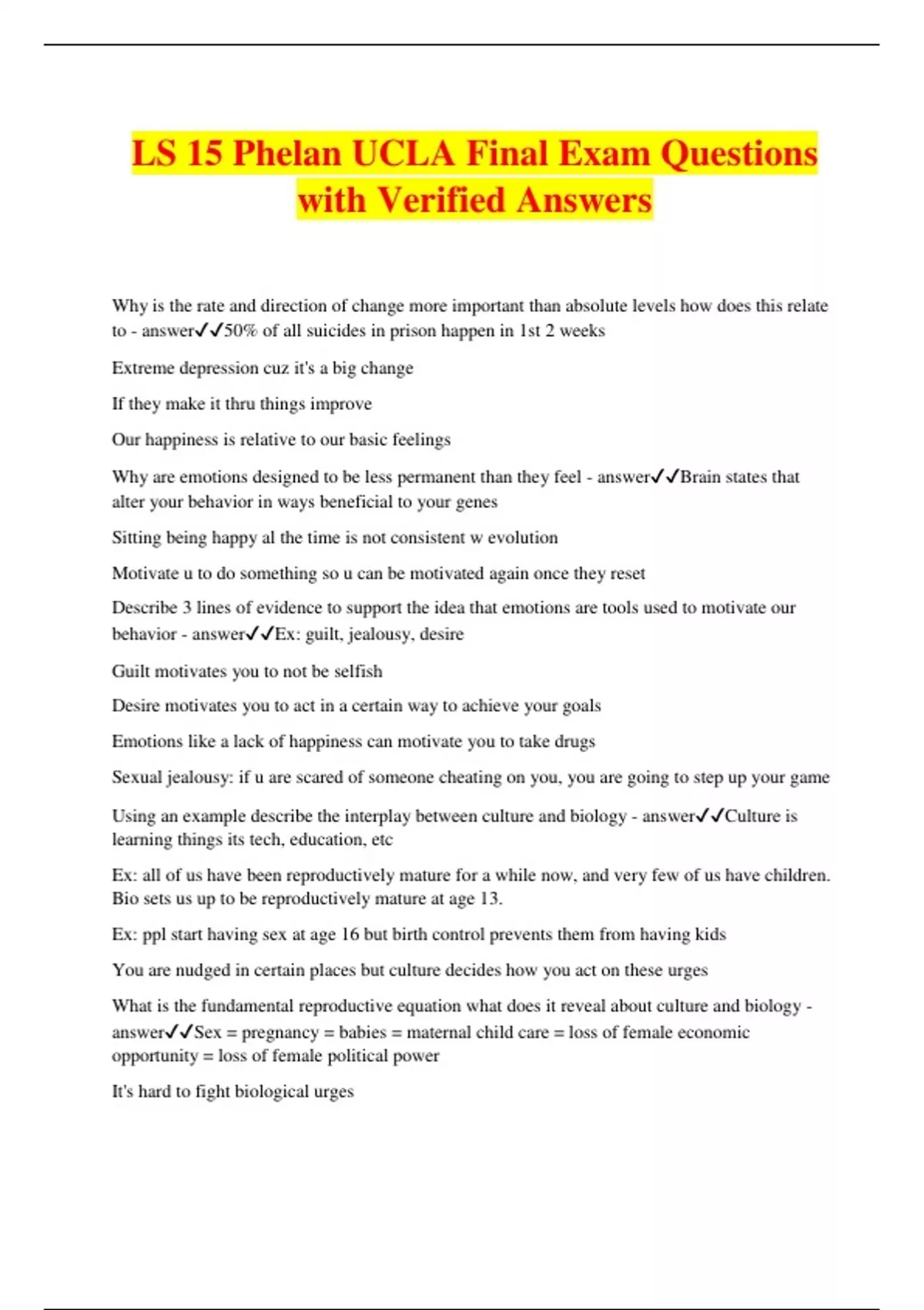 LS 15 Phelan UCLA Final Exam Questions with Verified Answers Why is the rate and direction of change more important than absolute levels how does this relate to - answer50% of all suicides in prison happen in 1st 2 weeks Extreme depression cuz it's a big change If they make it thru things improve Our happiness is relative to our basic feelings Why are emotions designed to be less permanent than they feel - answerBrain states that alter your behavior in ways beneficial to your genes Sitting being happy al the time is not consistent w evolution Motivate u to do something so u can be motivated again once they reset Describe 3 lines of evidence to support the idea that emotions are tools used to motivate our behavior - answerEx: guilt, jealousy, desire Guilt motivates you to not be selfish Desire motivates you to act in a certain way to achieve your goals Emotions like a lack of happiness can motivate you to take drugs Sexual jealousy: if u are scared of someone cheating on you, you are going to step up your game Using an example describe the interplay between culture and biology - answerCulture is learning things its tech, education, etc Ex: all of us have been reproductively mature for a while now, and very few of us have children. Bio sets us up to be reproductively mature at age 13. Ex: ppl start having sex at age 16 but birth control prevents them from having kids You are nudged in certain places but culture decides how you act on these urges What is the fundamental reproductive equation what does it reveal about culture and biology - answerSex = pregnancy = babies = maternal child care = loss of female economic opportunity = loss of female political power It's hard to fight biological urges Sex does not have to equal pregnancy -> rubber Pregnancy does not have to equal babies -> surgery Babies do not have to equal maternal child care -> rubber nipples Maternal childcare does not have to equal loss of female economic opportunity -> daycare Loss of female economic opportunity does not have to equal loss of female political power -> The cultural idea that the person in power doesn't need to have the most money basically democracy There are certain biological constraints on how we r built that unchecked can lead to undesirable outcomes Culture can block every step of the fundamental reproductive equation The invention of vulcanized rubber can stop that equation at 3 dif places Bio is not an excuse Using 2 examples explain what constrained learning is and how it illuminates culture biology - answerEx: It is easier to grasp a language at a younger age compared to learning a language at age 20 because it is a biological constraint. Rats could learn to associate certain stimuli and physical conditions but couldn't learn to associate others Associate nausea and weird taste Associate light+noise w electric shock But could never learn to not drink water Monkeys could not learn to be scared of flowers, but they were quick to learn to fear snakes You can know how to max cardiovascular fitness but it won't work the same for everyone Humans are quick to associate bad food with sickness rather than the actual bacteria that could have caused the sickness thru other ways What is the EEA? Why is it important for us to be aware of it? - answerThe environment of evolutionary adaptation A mismatch between EEA and the current environment when outcomes of NS arent appropriate anymore Male geese protect the eggs that roll of from a nest often bringing in unwanted items that resemble the shape of an egg