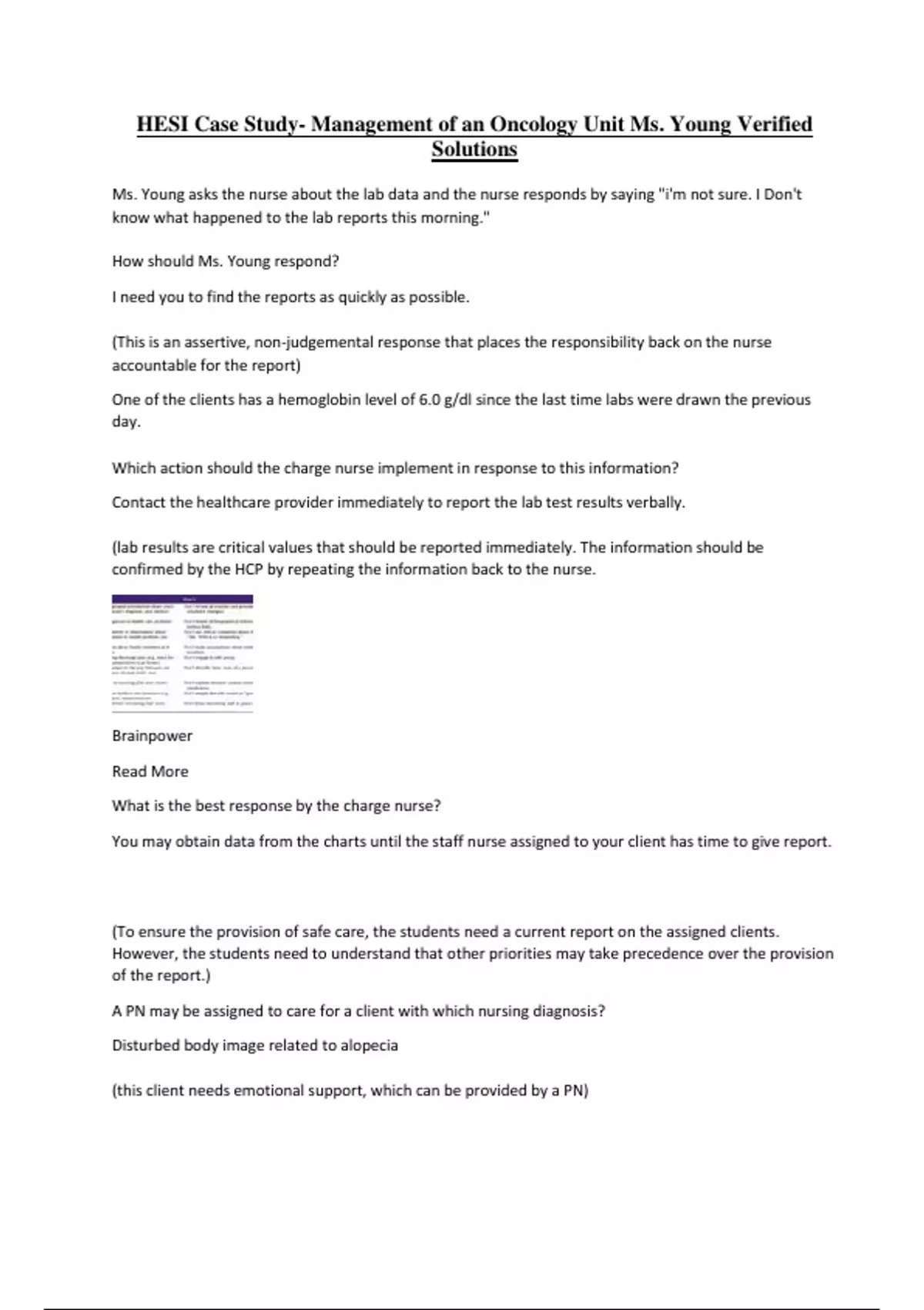 HESI Case Study- Management of an Oncology Unit Ms. Young Verified Solutions Ms. Young asks the nurse about the lab data and the nurse responds by saying "i'm not sure. I Don't know what happened to the lab reports this morning." How should Ms. Young respond? I need you to find the reports as quickly as possible. (This is an assertive, non-judgemental response that places the responsibility back on the nurse accountable for the report) One of the clients has a hemoglobin level of 6.0 g/dl since the last time labs were drawn the previous day. Which action should the charge nurse implement in response to this information? Contact the healthcare provider immediately to report the lab test results verbally. (lab results are critical values that should be reported immediately. The information should be confirmed by the HCP by repeating the information back to the nurse. Brainpower Read More What is the best response by the charge nurse? You may obtain data from the charts until the staff nurse assigned to your client has time to give report. (To ensure the provision of safe care, the students need a current report on the assigned clients. However, the students need to understand that other priorities may take precedence over the provision of the report.) A PN may be assigned to care for a client with which nursing diagnosis? Disturbed body image related to alopecia (this client needs emotional support, which can be provided by a PN) Which of the clients is experiencing pain management problems is the most appropriate assignment for the PN? Complaining of constipation after opioid analgesics for 1 week. Guidelines for Assigning Client Care Determine the amount of nursing care time required and the complexity of the activities allocated. Identify who, of the available staff, is best qualified to provide the client's care, considering attitudes, skills, demeanor, and efficiency. Consider each staff member as an individual with a unique combination of needs, skills, and talents. Strive to maximize continuity of care and reduce fragmentation. Combine assignments to increase efficiency; consider treatment schedules and geographic location of clients. Describe the assignment in measurable terms; be specific about expected results. Designate one person or an absolute minimum number of staff to be responsible for each client's care. Plan to provide additional help, direction, or instruction as necessary to match the needs of individual staff members. Communicate assignments clearly, preferably in writing. Follow-up frequently during the shift to check