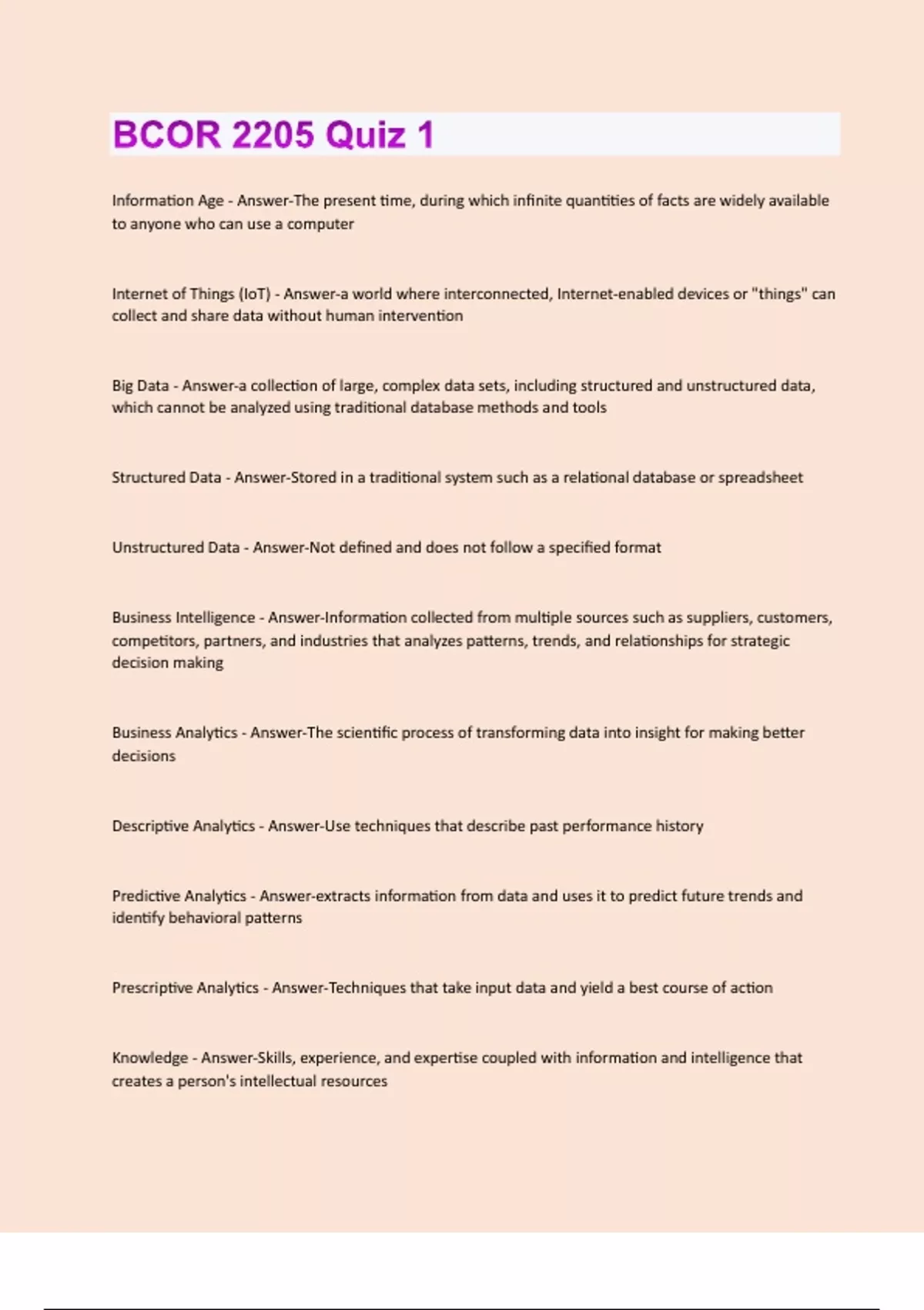 Information Age - Answer-The present time, during which infinite quantities of facts are widely available to anyone who can use a computer Internet of Things (IoT) - Answer-a world where interconnected, Internet-enabled devices or "things" can collect and share data without human intervention Big Data - Answer-a collection of large, complex data sets, including structured and unstructured data, which cannot be analyzed using traditional database methods and tools Structured Data - Answer-Stored in a traditional system such as a relational database or spreadsheet Unstructured Data - Answer-Not defined and does not follow a specified format Business Intelligence - Answer-Information collected from multiple sources such as suppliers, customers, competitors, partners, and industries that analyzes patterns, trends, and relationships for strategic decision making Business Analytics - Answer-The scientific process of transforming data into insight for making better decisions Descriptive Analytics - Answer-Use techniques that describe past performance history Predictive Analytics - Answer-extracts information from data and uses it to predict future trends and identify behavioral patterns Prescriptive Analytics - Answer-Techniques that take input data and yield a best course of action Knowledge - Answer-Skills, experience, and expertise coupled with information and intelligence that creates a person's intellectual resourcesData Mining - Answer-The process of analyzing data to extract information not offered by the raw data alone Data Profiling - Answer-The process of collecting statistics and information about data in an existing source Data Replication - Answer-The process of sharing information to ensure consistency between multiple data sources Recommendation Engine - Answer-A data-mining algorithm that analyzes a customer's purchases and actions on a website and then uses the data to recommend complementary products Classification - Answer-Assigns records to one of a predefined set of classes Estimation - Answer-Determines values for an unknown continuous variable behavior or estimated future value Affinity Grouping - Answer-Determines which things go together Clustering - Answer-Segments a heterogeneous population of records into a number of more homogeneous subgroups Optimization Model - Answer-A statistical process that finds a way to make a design, system, or decision as effective as possible Time-Series Information - Answer-Time-stamped information collected at a particular frequency Forecasting Model - Answer-Predictions based on time-series information allowing users to manipulate the time series for forecasting activities Regression Model - Answer-A statistical process for estimating the relationships among variablesDirect-to-Consumer (DTC) - Answer-Ebusiness model where the companies build, market, sell, and ship their products themselves, without relying on traditional sores or intermediaries Open System - Answer-Nonproprietary hardware and software based on publicly known standards that allows third parties to create add-on products to plug into or interoperate with the system Open Source Software - Answer-Refers to any software whose source code is made available for free for any third party to review or modify User-Contributed Content - Answer-Created and updated by many users for many users Collaboration System - Answer-Tools that support the work of teams or groups by facilitating the sharing and flow of information