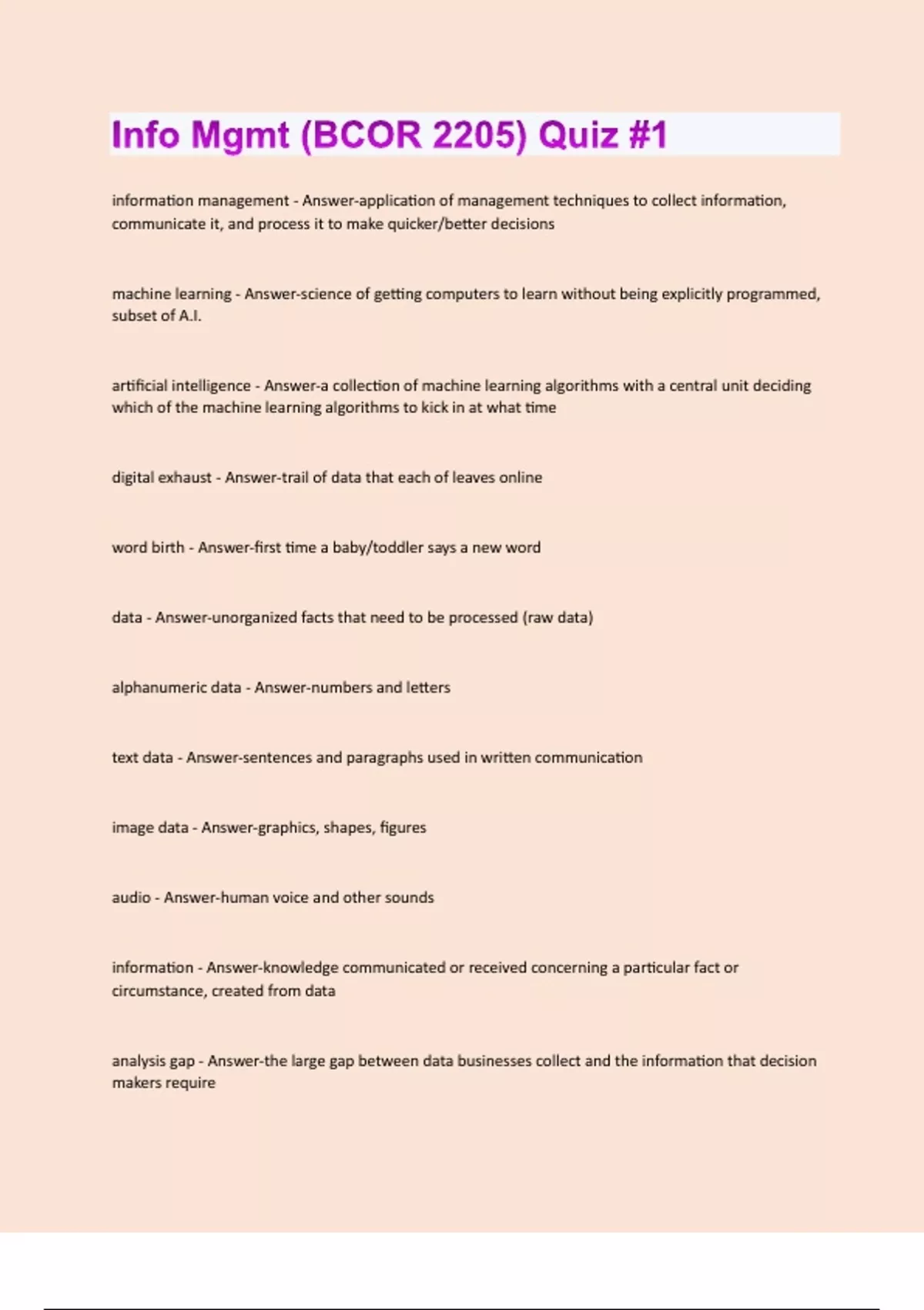 Info Mgmt (BCOR 2205) Quiz #1 Questions and Answers with complete solution