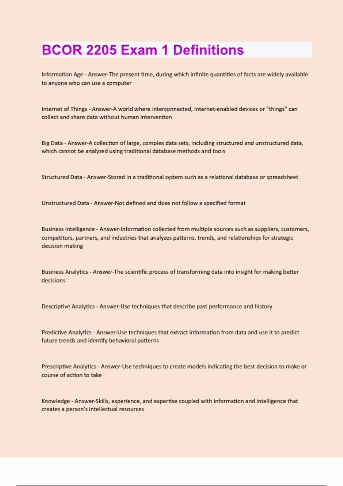 Information Age - Answer-The present time, during which infinite quantities of facts are widely available to anyone who can use a computer Internet of Things - Answer-A world where interconnected, Internet-enabled devices or "things" can collect and share data without human intervention Big Data - Answer-A collection of large, complex data sets, including structured and unstructured data, which cannot be analyzed using traditional database methods and tools Structured Data - Answer-Stored in a traditional system such as a relational database or spreadsheet Unstructured Data - Answer-Not defined and does not follow a specified format Business Intelligence - Answer-Information collected from multiple sources such as suppliers, customers, competitors, partners, and industries that analyzes patterns, trends, and relationships for strategic decision making Business Analytics - Answer-The scientific process of transforming data into insight for making better decisions Descriptive Analytics - Answer-Use techniques that describe past performance and history Predictive Analytics - Answer-Use techniques that extract information from data and use it to predict future trends and identify behavioral patterns Prescriptive Analytics - Answer-Use techniques to create models indicating the best decision to make or course of action to take Knowledge - Answer-Skills, experience, and expertise coupled with information and intelligence that creates a person's intellectual resourcesData Mining - Answer-The process of analyzing data to extract information not offered by the raw data alone Data Profiling - Answer-The process of collecting statistics and information about data in an existing source Data Replication - Answer-The process of sharing information to ensure consistency between multiple data sources Recommendation Engine - Answer-A data-mining algorithm that analyzes a customer's purchases and actions on a website and then uses the data to recommend complementary products Classification - Answer-Assigns records to one of a predefined set of classes Estimation - Answer-Determines values for an unknown continuous variable behavior or estimated future value Affinity Grouping - Answer-Determines which things go together Clustering - Answer-Segments a heterogeneous population of records into a number of more homogeneous subgroups Optimization Model - Answer-A statistical process that finds the way to make a design, system, or decision as effective as possible, for example, finding the values of controllable variables that determine maximal productivity or minimal waste. Time-series Information - Answer-Timestamped information collected at a particular frequency Forecasting Model - Answer-Predictions based on time-series information allowing users to manipulate the time series for forecasting activitiesRegression Model - Answer-A statistical process for estimating the relationships among variables Direct-to-consumer - Answer-Ebusiness model where companies build, market, sell, and ship their products themselves, without relying on traditional stores or intermediaries Open System - Answer-Nonproprietary hardware and software based on publicly known standards that allows third parties to create add-on products to plug into or interoperate with the system Open Source Software - Answer-Refers to any software whose source code is made available for free for any third party to review or modify User Contributed Content - Answer-Created and updated by many users for many users Collaboration System - Answer-Tools that support the work of teams or groups by facilitating the sharing and flow of information Collective Intelligence - Answer-Collaborating and tapping into the core knowledge of all employees, partners, and customers Knowledge Management - Answer-Involves capturing, classifying, evaluating, retrieving, and sharing information assets in a way that provides context for effective decisions and actions Knowledge Management System - Answer-Supports the capturing, organization, and dissemination of knowledge throughout an organization Cloud Computing - Answer-Stores, manages, and processes data and applications over the internet rather than on a personal computer or server Virtualization - Answer-Creates multiple "virtual" machines on a single computing device CrowdSourcing - Answer-Using the wisdom of the crowdCrowdFunding - Answer-Sources capital for a project by raising many small amounts from a large number of individuals, typically via the internet Synchronous Communication - Answer-occur at the same time such as IM or chat Asynchronous Communication - Answer-Message and response do not occur at the same time; email