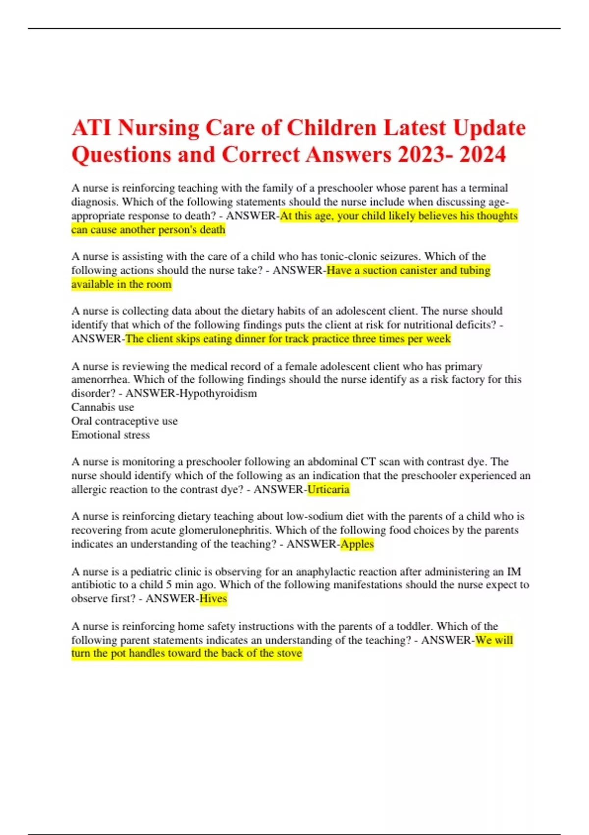 ATI Nursing Care of Children Latest Update Questions and Correct Answers
