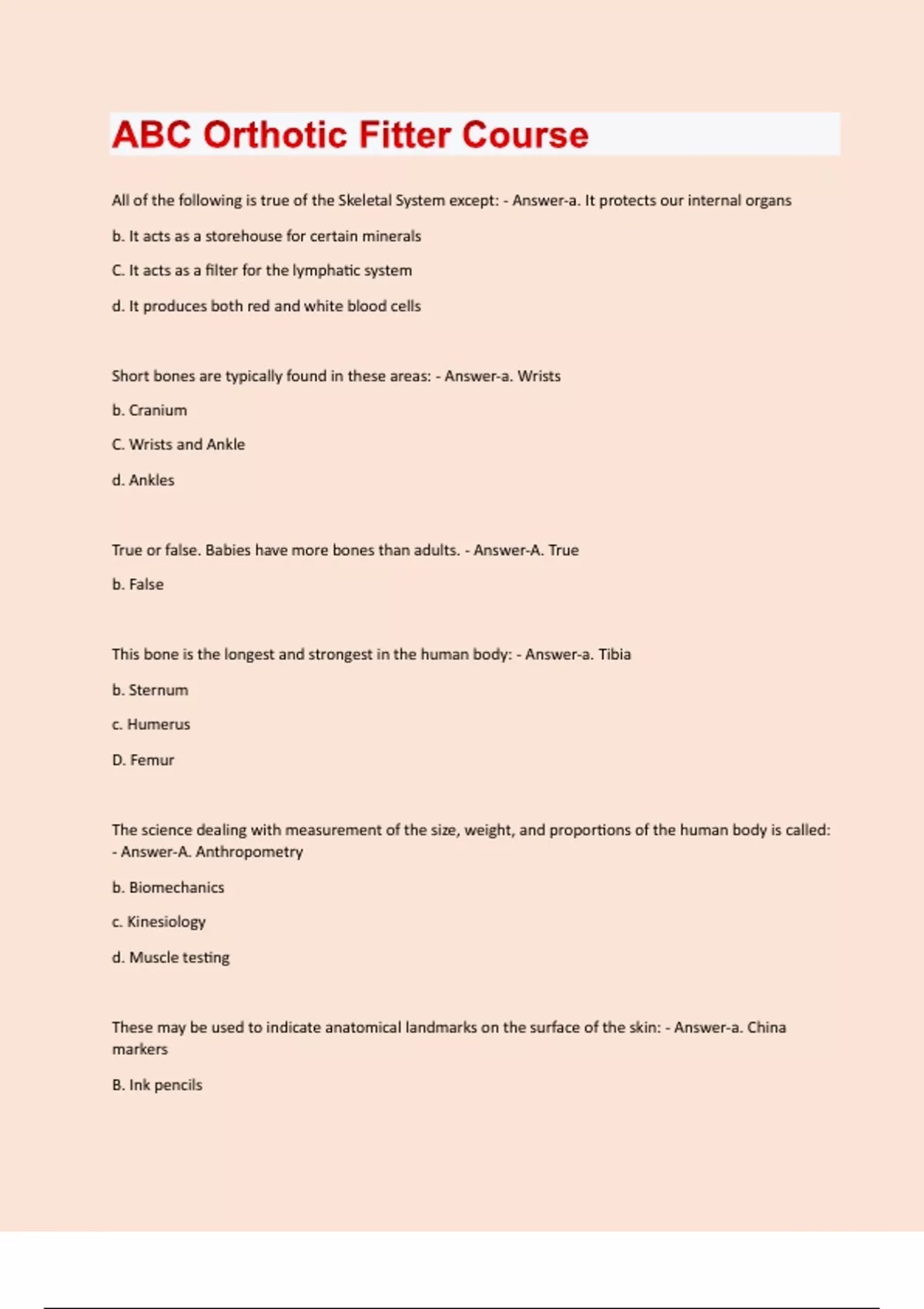 All of the following is true of the Skeletal System except: - Answer-a. It protects our internal organs b. It acts as a storehouse for certain minerals C. It acts as a filter for the lymphatic system d. It produces both red and white blood cells Short bones are typically found in these areas: - Answer-a. Wrists b. Cranium C. Wrists and Ankle d. Ankles True or false. Babies have more bones than adults. - Answer-A. True b. False This bone is the longest and strongest in the human body: - Answer-a. Tibia b. Sternum c. Humerus D. Femur The science dealing with measurement of the size, weight, and proportions of the human body is called: - Answer-A. Anthropometry b. Biomechanics c. Kinesiology d. Muscle testing These may be used to indicate anatomical landmarks on the surface of the skin: - Answer-a. China markers B. Ink pencilsc. Crayon d. Pencils Landmarks of the foot include all but: - Answer-A. Tibial Crest b. Metatarsal Heads c. Styloid Process d. Navicular The symphysis pubis is located in the: - Answer-a. Upper Extremity b. Posterior trunk C. Anterior trunk d. Lower Extremity Measurements that are done at the Natural Waist would include all but: - Answer-a. Circumfrential BAngular c. M/L d. A/P Measuring from floor to knee center would be this type of measurement: - Answer-a. M/L B. Length c. Circumfrential d. A/P This is a lower extremity landmark: - Answer-a. Xiphoid Process B. Styloid Process c. ASIS d. Sternal Notch The Lateral malleolus is the distal end of the: - Answer-a. FemurB. Fibula c. Sternum d. Tibia The Popliteal Fossa is located in the: - Answer-a. Anterior Lower Extremity B. Posterior Lower Extremity c. Anterior Trunk d. Posterior Trunk