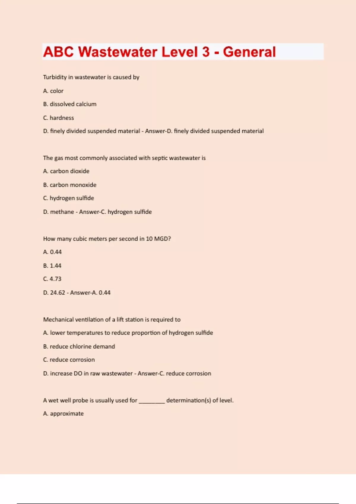 Turbidity in wastewater is caused by A. color B. dissolved calcium C. hardness D. finely divided suspended material - Answer-D. finely divided suspended material The gas most commonly associated with septic wastewater is A. carbon dioxide B. carbon monoxide C. hydrogen sulfide D. methane - Answer-C. hydrogen sulfide How many cubic meters per second in 10 MGD? A. 0.44 B. 1.44 C. 4.73 D. 24.62 - Answer-A. 0.44 Mechanical ventilation of a lift station is required to A. lower temperatures to reduce proportion of hydrogen sulfide B. reduce chlorine demand C. reduce corrosion D. increase DO in raw wastewater - Answer-C. reduce corrosion A wet well probe is usually used for ________ determination(s) of level. A. approximateB. dual point C. continuous D. single point - Answer-D. single point A pump is delivering at less than the expected rate of discharge. Which of the causes listed below is incorrect? A. speed of motor too low B. pump not primed C. impeller clogged D. discharge head too low - Answer-D. discharge head too low Metal pipes often fail because of A. back siphonage B. browning movement C. galvanic action D. reverse osmosis - Answer-C. galvanic action