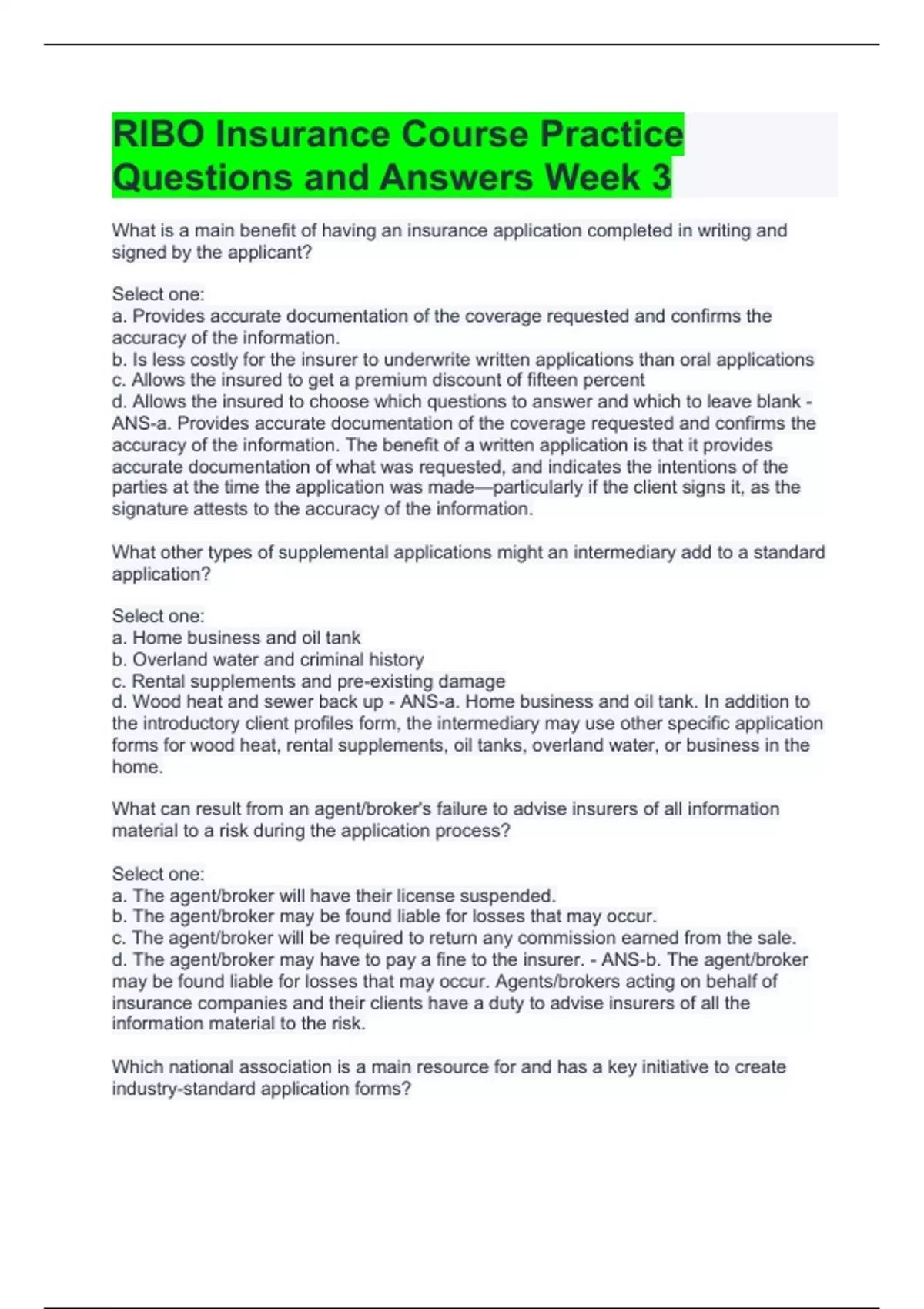 RIBO Insurance Course Practice Questions and Answers Week 3