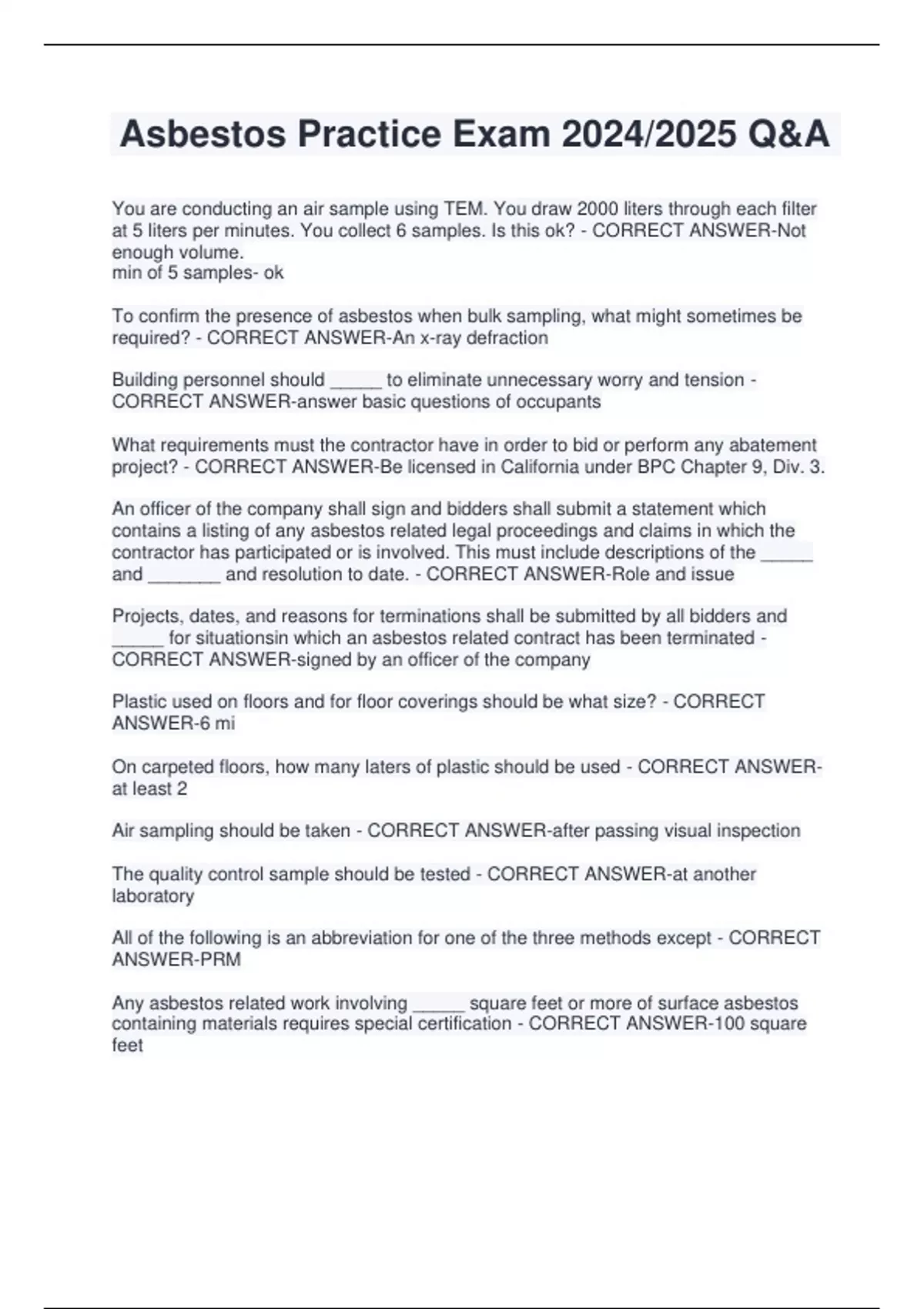 Asbestos Practice Exam 2024/2025 Q&A You are conducting an air sample using TEM. You draw 2000 liters through each filter at 5 liters per minutes. You collect 6 samples. Is this ok? - CORRECT ANSWER-Not enough volume. min of 5 samples- ok To confirm the presence of asbestos when bulk sampling, what might sometimes be required? - CORRECT ANSWER-An x-ray defraction Building personnel should _____ to eliminate unnecessary worry and tension - CORRECT ANSWER-answer basic questions of occupants What requirements must the contractor have in order to bid or perform any abatement project? - CORRECT ANSWER-Be licensed in California under BPC Chapter 9, Div. 3. An officer of the company shall sign and bidders shall submit a statement which contains a listing of any asbestos related legal proceedings and claims in which the contractor has participated or is involved. This must include descriptions of the _____ and _______ and resolution to date. - CORRECT ANSWER-Role and issue Projects, dates, and reasons for terminations shall be submitted by all bidders and _____ for situationsin which an asbestos related contract has been terminated - CORRECT ANSWER-signed by an officer of the company Plastic used on floors and for floor coverings should be what size? - CORRECT ANSWER-6 mi On carpeted floors, how many laters of plastic should be used - CORRECT ANSWERat least 2 Air sampling should be taken - CORRECT ANSWER-after passing visual inspection The quality control sample should be tested - CORRECT ANSWER-at another laboratory All of the following is an abbreviation for one of the three methods except - CORRECT ANSWER-PRM Any asbestos related work involving _____ square feet or more of surface asbestos containing materials requires special certification - CORRECT ANSWER-100 square feet