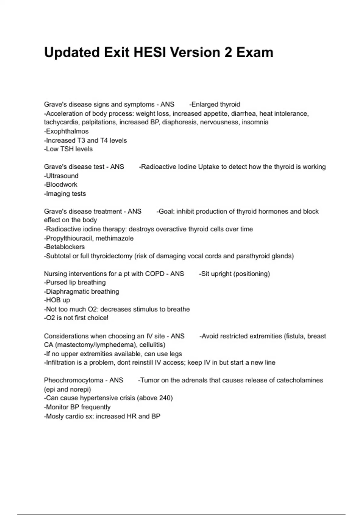 Grave's disease signs and symptoms - ANS -Enlarged thyroid -Acceleration of body process: weight loss, increased appetite, diarrhea, heat intolerance, tachycardia, palpitations, increased BP, diaphoresis, nervousness, insomnia -Exophthalmos -Increased T3 and T4 levels -Low TSH levels Grave's disease test - ANS -Radioactive Iodine Uptake to detect how the thyroid is working -Ultrasound -Bloodwork -Imaging tests Grave's disease treatment - ANS -Goal: inhibit production of thyroid hormones and block effect on the body -Radioactive iodine therapy: destroys overactive thyroid cells over time -Propylthiouracil, methimazole -Betablockers -Subtotal or full thyroidectomy (risk of damaging vocal cords and parathyroid glands) Nursing interventions for a pt with COPD - ANS -Sit upright (positioning) -Pursed lip breathing -Diaphragmatic breathing -HOB up -Not too much O2: decreases stimulus to breathe -O2 is not first choice! Considerations when choosing an IV site - ANS -Avoid restricted extremities (fistula, breast CA (mastectomy/lymphedema), cellulitis) -If no upper extremities available, can use legs -Infiltration is a problem, dont reinstill IV access; keep IV in but start a new line Pheochromocytoma - ANS -Tumor on the adrenals that causes release of catecholamines (epi and norepi) -Can cause hypertensive crisis (above 240) -Monitor BP frequently -Mosly cardio sx: increased HR and BP General teaching points for pt taking meds - ANS -Take the full dose of antibiotics (can build resistance) -Pay attention to timing and whether you take with food or on an empty stomach Describe post-surgical nursing assessment - ANS -VITALS!! -Take VS first to give you "the lay of the land" and plan further treatment -Watch for shock and hemorrhaging -Make sure BP is above 90 -Give O2 if decreased sat -Look/ask about pain if HR increased Describe Lupus and pt education - ANS -*Autoimmune disord