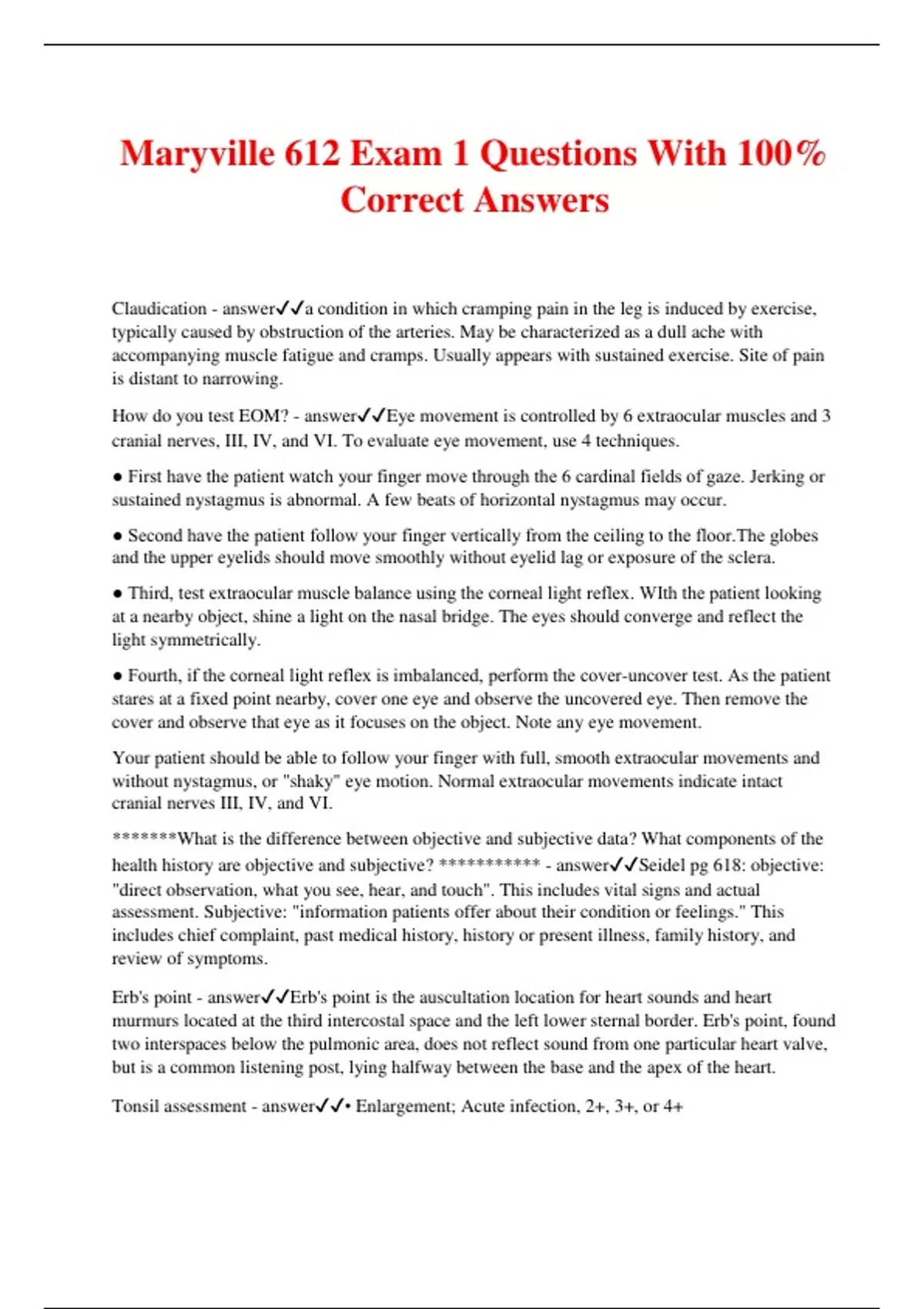 Maryville 612 Exam 1 Questions With 100% Correct Answers Claudication - answera condition in which cramping pain in the leg is induced by exercise, typically caused by obstruction of the arteries. May be characterized as a dull ache with accompanying muscle fatigue and cramps. Usually appears with sustained exercise. Site of pain is distant to narrowing. How do you test EOM? - answerEye movement is controlled by 6 extraocular muscles and 3 cranial nerves, III, IV, and VI. To evaluate eye movement, use 4 techniques. ● First have the patient watch your finger move through the 6 cardinal fields of gaze. Jerking or sustained nystagmus is abnormal. A few beats of horizontal nystagmus may occur. ● Second have the patient follow your finger vertically from the ceiling to the floor.The globes and the upper eyelids should move smoothly without eyelid lag or exposure of the sclera. ● Third, test extraocular muscle balance using the corneal light reflex. WIth the patient looking at a nearby object, shine a light on the nasal bridge. The eyes should converge and reflect the light symmetrically. ● Fourth, if the corneal light reflex is imbalanced, perform the cover-uncover test. As the patient stares at a fixed point nearby, cover one eye and observe the uncovered eye. Then remove the cover and observe that eye as it focuses on the object. Note any eye movement. Your patient should be able to follow your finger with full, smooth extraocular movements and without nystagmus, or "shaky" eye motion. Normal extraocular movements indicate intact cranial nerves III, IV, and VI. *******What is the difference between objective and subjective data? What components of the health history are objective and subjective? *********** - answerSeidel pg 618: objective: "direct observation, what you see, hear, and touch". This includes vital signs and actual assessment. Subjective: "information patients offer about their condition or feelings." This includes chief complaint, past medical history, history or present illness, family history, and review of symptoms. Erb's point - answerErb's point is the auscultation location for heart sounds and heart murmurs located at the third intercostal space and the left lower sternal border. Erb's point, found two interspaces below the pulmonic area, does not reflect sound from one particular heart valve, but is a common listening post, lying halfway between the base and the apex of the heart. Tonsil assessment - answer• Enlargement; Acute infection, 2+, 3+, or 4+ o 1+ - visible o 2+ halfway between tonsillar pillars o 3+ touching uvula o 4+ touching each other Order physical assessment is done - answerInspection, Palpation, Percussion, Auscultation Proper use of Otoscope on adult or child - answerAdult- straighten the external auditory canal by pulling auricle up and back Child- face child sideways with one arm around parents waist. Pull auricle either downward and back or upward and back to gain best view of tympanic membrane. How do you assess for sensoineural hearing loss - answerair conduction heard longer than bone conduction with Rinne Test; lateralization to unaffected ear; loss of high-frequency sounds How do you assess for conductive hearing loss - answerbone conduction heard longer than air conduction with Rinne Test; lateralization to affected ear with Weber Test; loss of low frequency sounds; loss of 11-30 decibels on audiometry with cerumen impaction. Rinne Test***** - answerhelps distinguish whether patient hears better by air or bone conduction. Place the tuning fork at base of vibrating tuning fork against the patient's mastoid bone and ask patient to tell you when the sound is no longer heard. Time this interval of bone conduction noting number of seconds. Continue timing the interval of sound due to by air conduction heard by the patient. Compare # of seconds air vs. bone. Air conducted should be heard twice as long as bone conducted sounds. (If bone conducted heard for 15 seconds, air conducted should be heard for additional 15 seconds). Weber Test - answerhelps assess unilateral hearing loss. Place base of fork on mid-line of patient's head. Ask patient if sound heard equally in both ears or in one ear (lateralization of sound). Should hear sound equally. Presbyopia - answerProgressive weakening of accommodation (focusing power). The major physiologic change that occurs after the age of 45 years; the lens becomes more rigid, and the ciliary muscle becomes weaker. Strabismus - answera condition in which both eyes do not focus on the object simultaneously, although either eye can focus independently; may be paralytic or non-paralytic. Photopsia - answerpresence of perceived flashes of light. (Most commonly associated with posterior vitreous detachment, migraine with aura, retinal break, or detachment). Amblyopia - answeralso called lazy eye; is disorder of sight d/t eye and brain not working well together. Results in decreased vision in an eye that otherwise typically appears normal. Most common cause of decreased vision in a single eye among children and younger adults. Macular Degeneration - answeris caused when part of the retina deteriorates; dry (atrophic) from gradual breakdown of cells in macula resulting in gradual blurring of central vision and wet (exudative or neovascular)- new abnormal vessels grow under the center of the retina; the blood vessels leak, bleed, and scar the retina, distorting or destroying central vision. In contrast to dry, vision loss may be rapid. Is leading cause of blindness in older than 55 years of age in U.S. Xanthelasma - answercondition characterized by elevated plaque of cholesterol; commonly found on the nasal portion of the eyelid. Snellen Test***** - answerThe optic nerve is assessed by testing for visual acuity and peripheral vision. Visual acuity is tested using a snellen chart, for those who are illiterate and unfamiliar with the western alphabet, the illiterate E chart, in which the letter E faces in differe